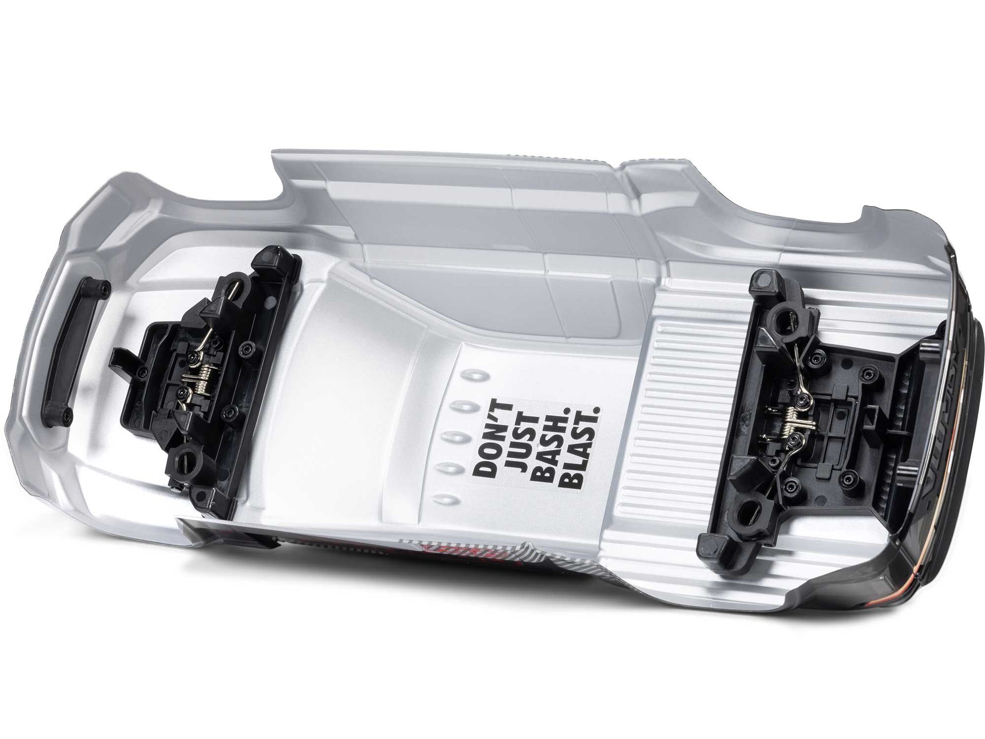 Factory assembled and installed, the heavy-duty, metal gear differentials send power from the Spektrum 3100Kv brushless motor to all four wheels for bashing on dirt, gravel, or short grass. Set up ramps or build a few dirt mounds to grab some air without worrying about the landing – an independent suspension and oil-filled shocks soak up bumps. Extended height side guards on the strong composite chassis combine with the close-fitting body to keep dirt and debris out of the chassis tub. When maintenance is needed, the hidden clipless body retention system allows quick, easy chassis access.