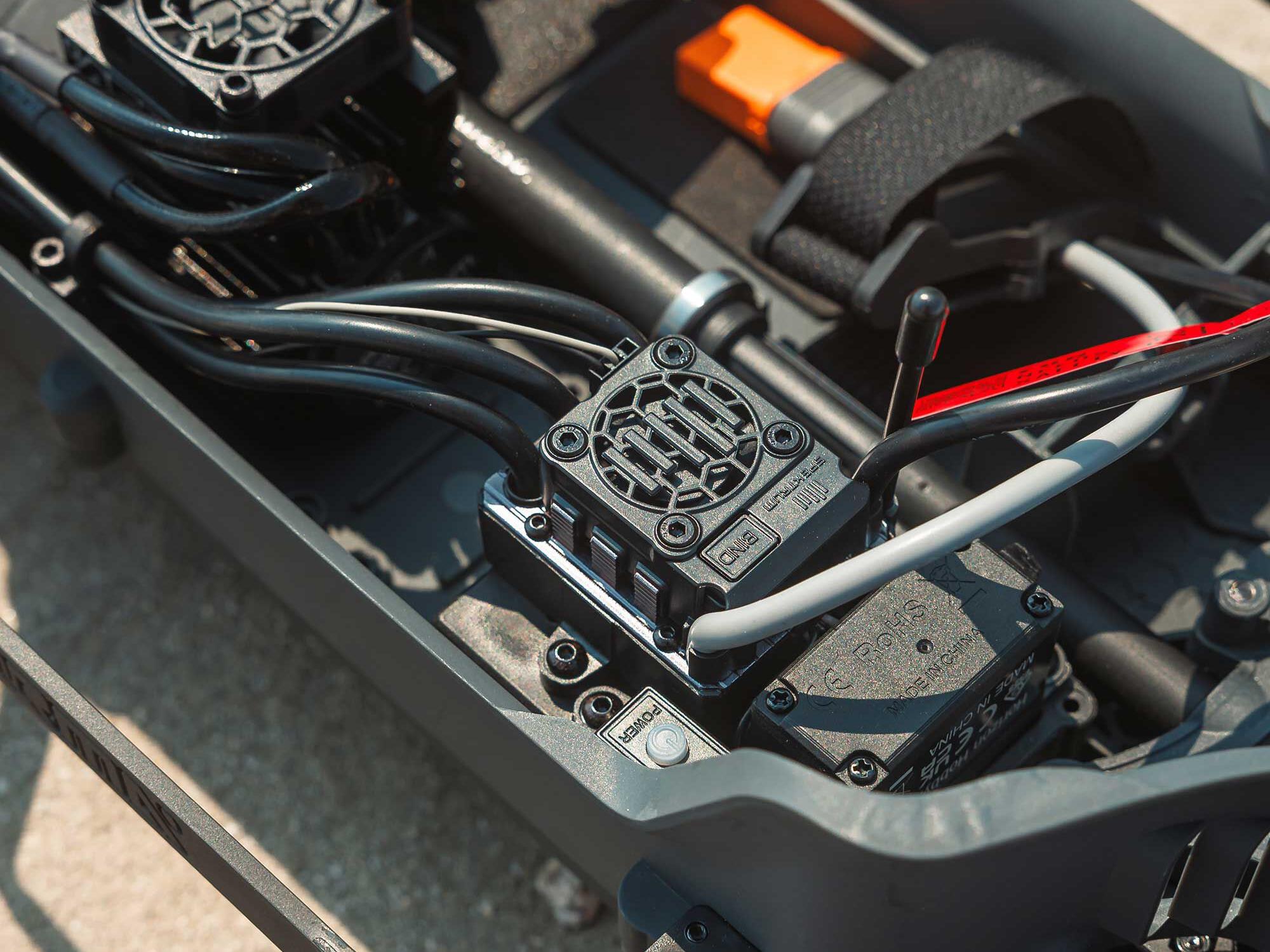 Factory assembled and installed, the heavy-duty, metal gear differential sends power from the Spektrum 3100Kv brushless motor to all four wheels for blasting through challenging terrain. The entire power system is well-protected for dependable performance on all terrain.