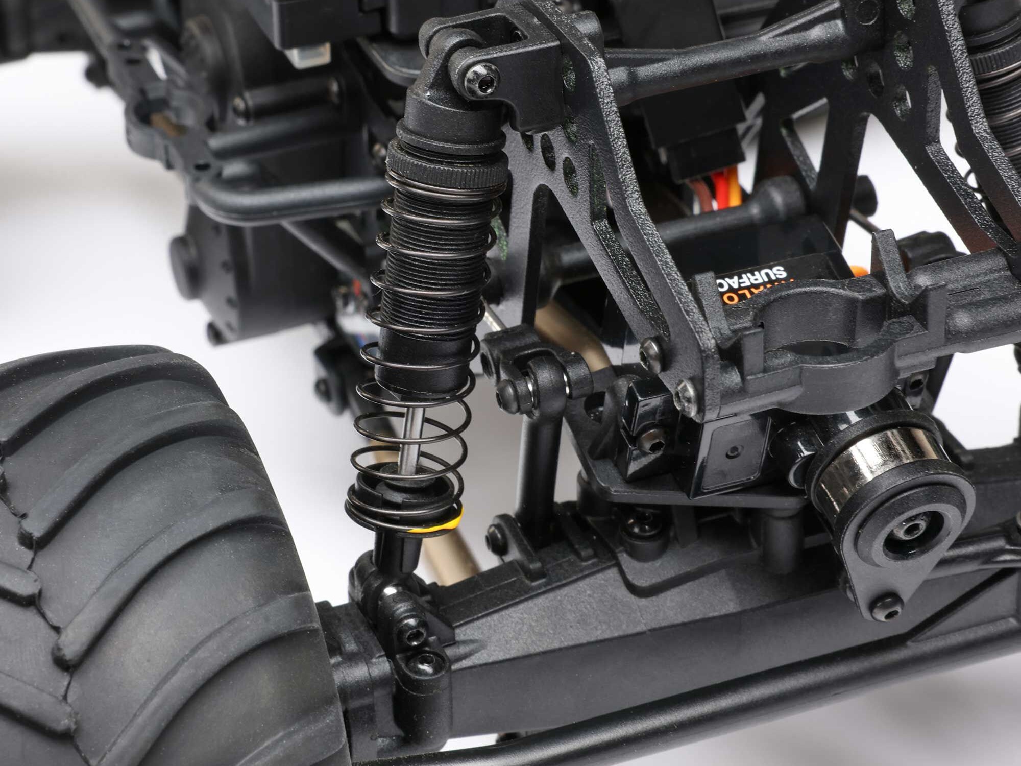 The solid axle 4-link monster truck suspension system provides smooth handling and stability. Sway bars keep the suspension flat while cornering for improved lap times when racing.