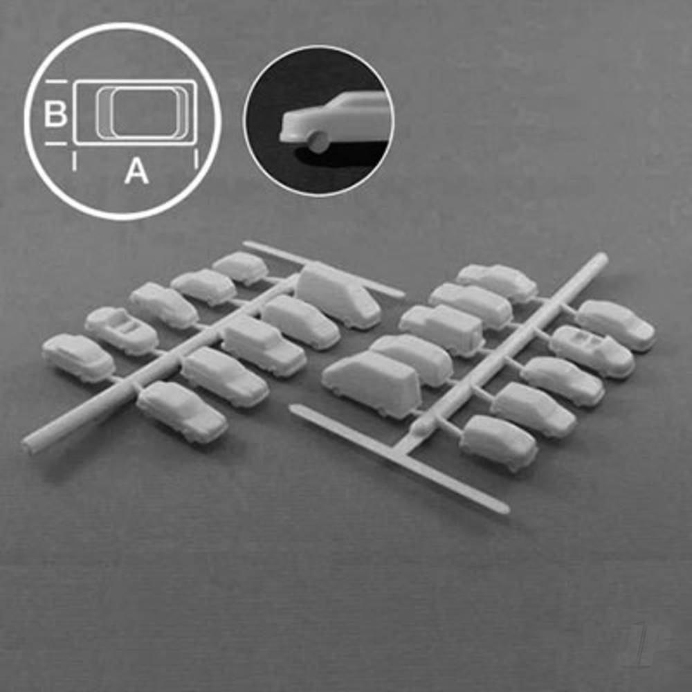 A set of 20 plastic cars for use on 1:200 scale architectural models.