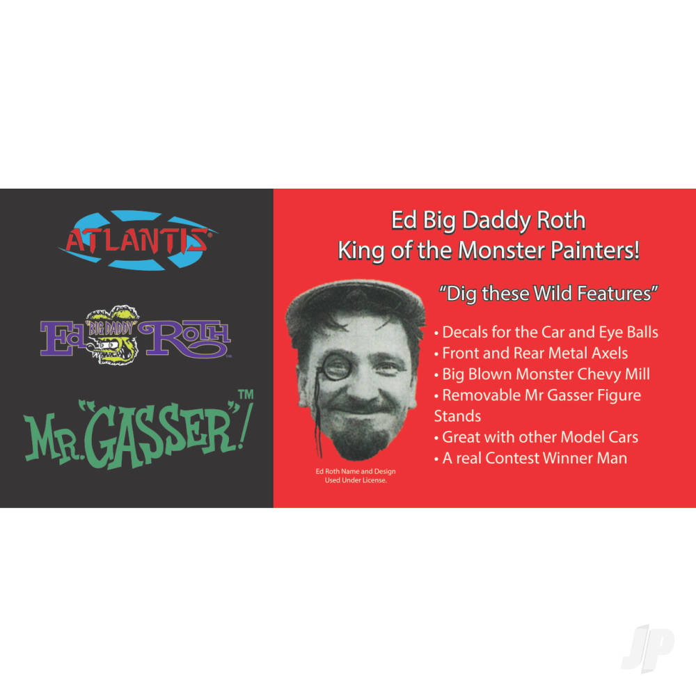 1:32 Scale Roughly! moulded in white the kit includes metal axles and decal sheet for the car and eyeballs. One of our favorite creations from the King of Monster Painters Ed Big Daddy Roth. Mr Gasser figure stands on his own. This kit features retro box art and is officially licensed. What a classic!