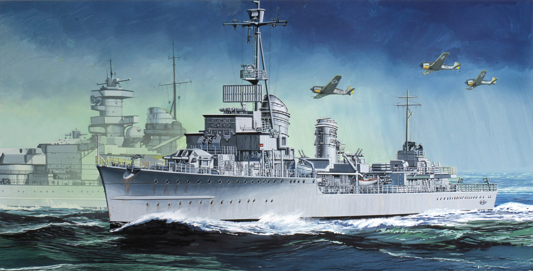 Germany produced a total of 15 Zerstörer 1936A-class destroyers, which the Allies referred to as the Narvik class. They were actually closer in size to a light cruiser than a destroyer, and they were known only by their hull numbers and didn’t receive any name. They sported powerful 5.9-inch guns, with the last three destroyers constructed by F. Krupp Germaniawerft AG in Kiel. Z38 was the penultimate destroyer of the class after being commissioned on 20 March 1943. One of its first combat missions was to escort the Scharnhorst battleship, and near the end of the war it operated in the Baltic Sea as German forces retreated. Z38 had a combat displacement of 3,691 tons and required a crew of 330 sailors. After WWII it was seized by the UK and used as a test ship under the name Nonsuch before being scrapped in 1950.