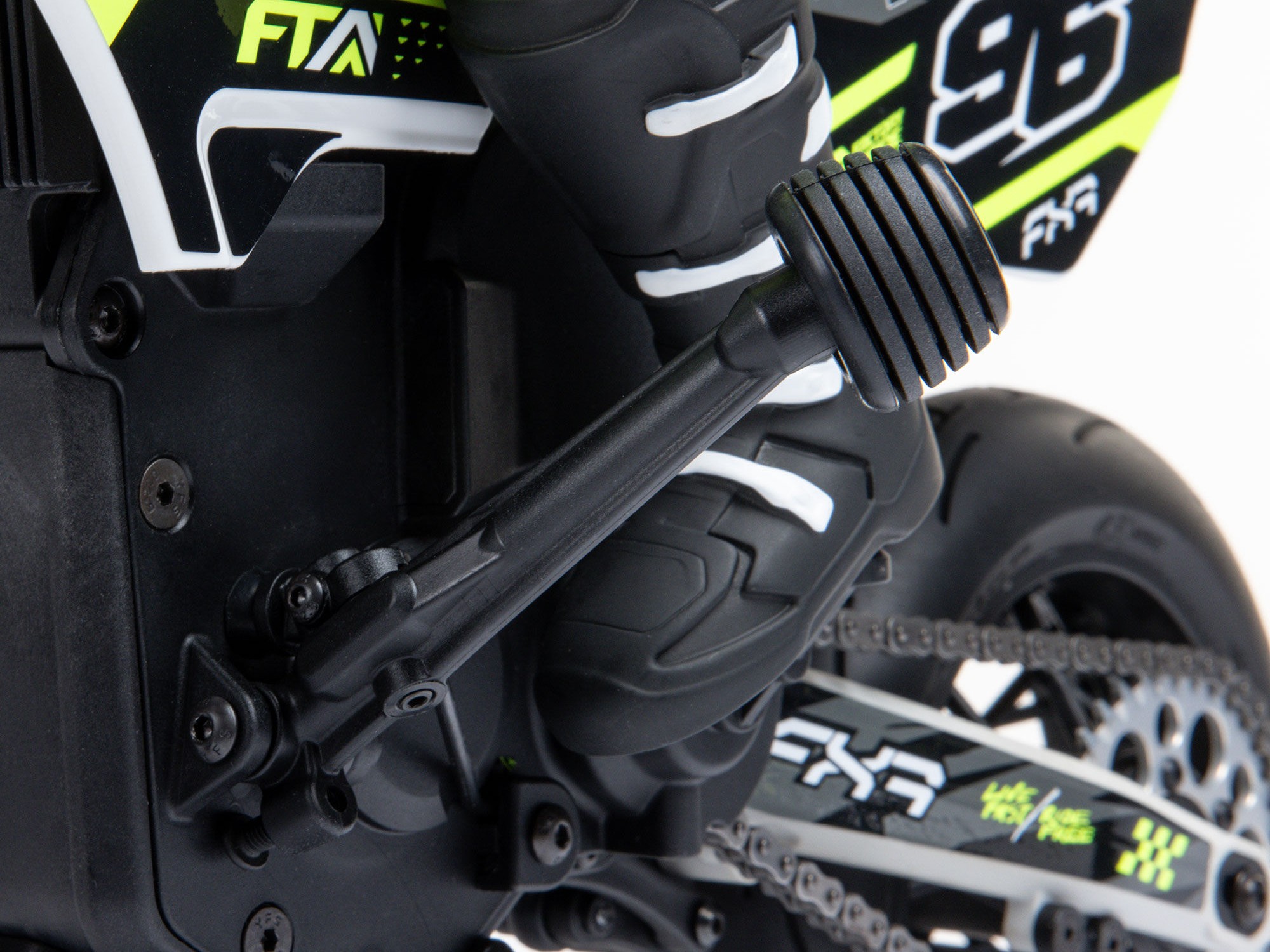 The Losi Promoto-SM also looks like a true supermoto bike. Its distinctive visual details include hand guards, shortened front fender, and officially licensed FXR graphics and rider gear.