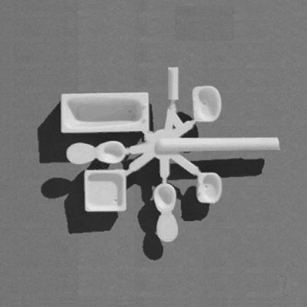 A bathroom set that includes a bath, shower tray, pedestal basins and lidded toilets suitable for 1:50 scale architectural and interior design model making.