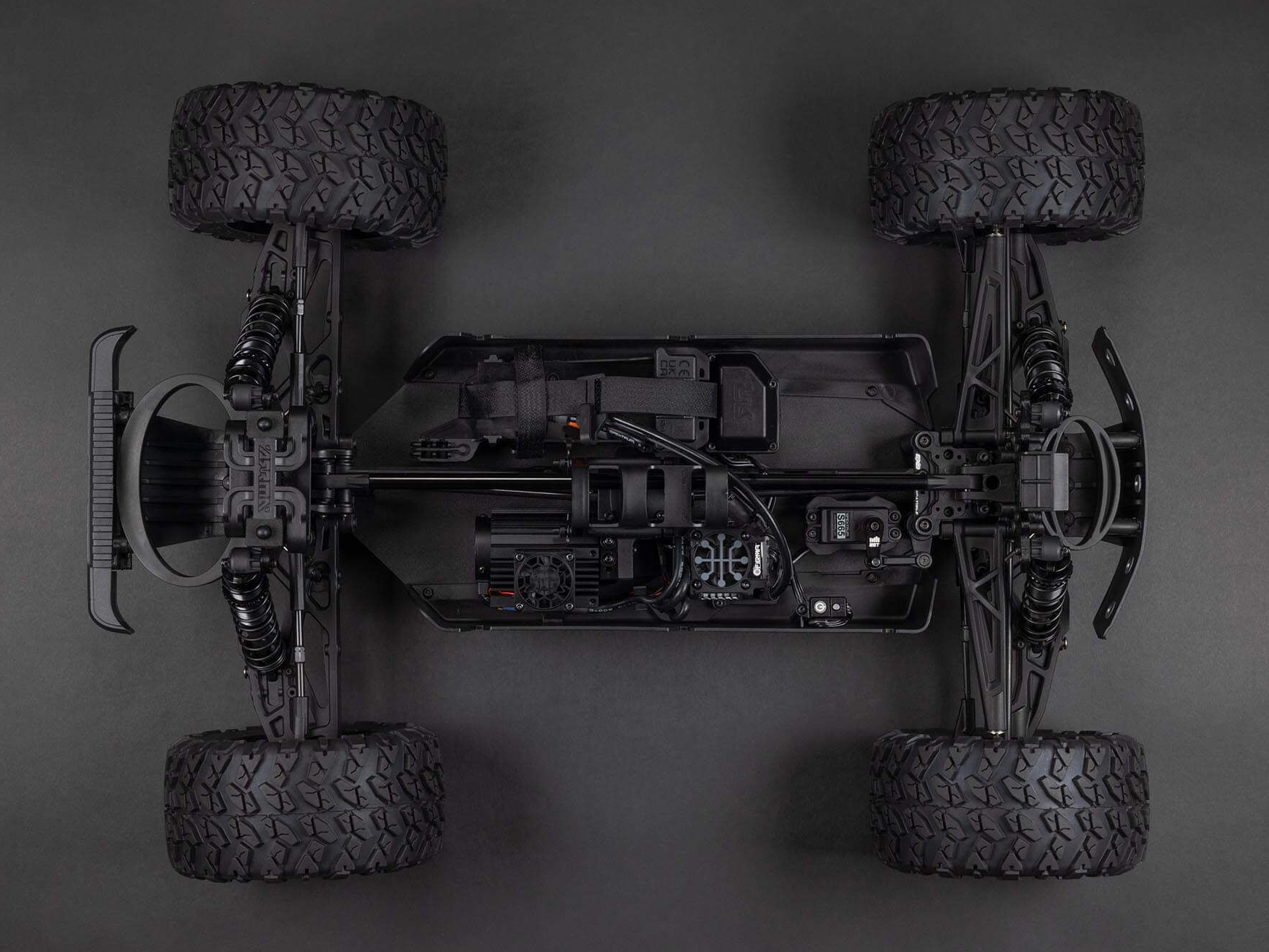 The 1/7 scale ARRMA® BIG ROCK™ 6S BLX RTR monster truck is engineered for amped-up, high-speed blasting. It features a black-anodized aluminium chassis with strong composite side guards, centre body support and brace for maximum durability. The heavy-duty drivetrain includes all-metal diff outdrives and gearbox internals. Durable steel driveshafts are used throughout.