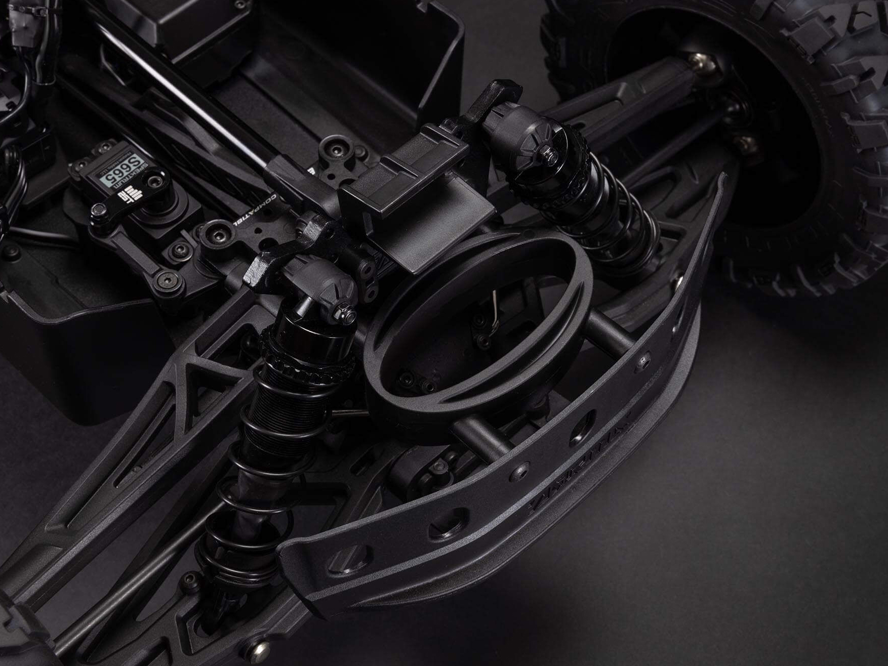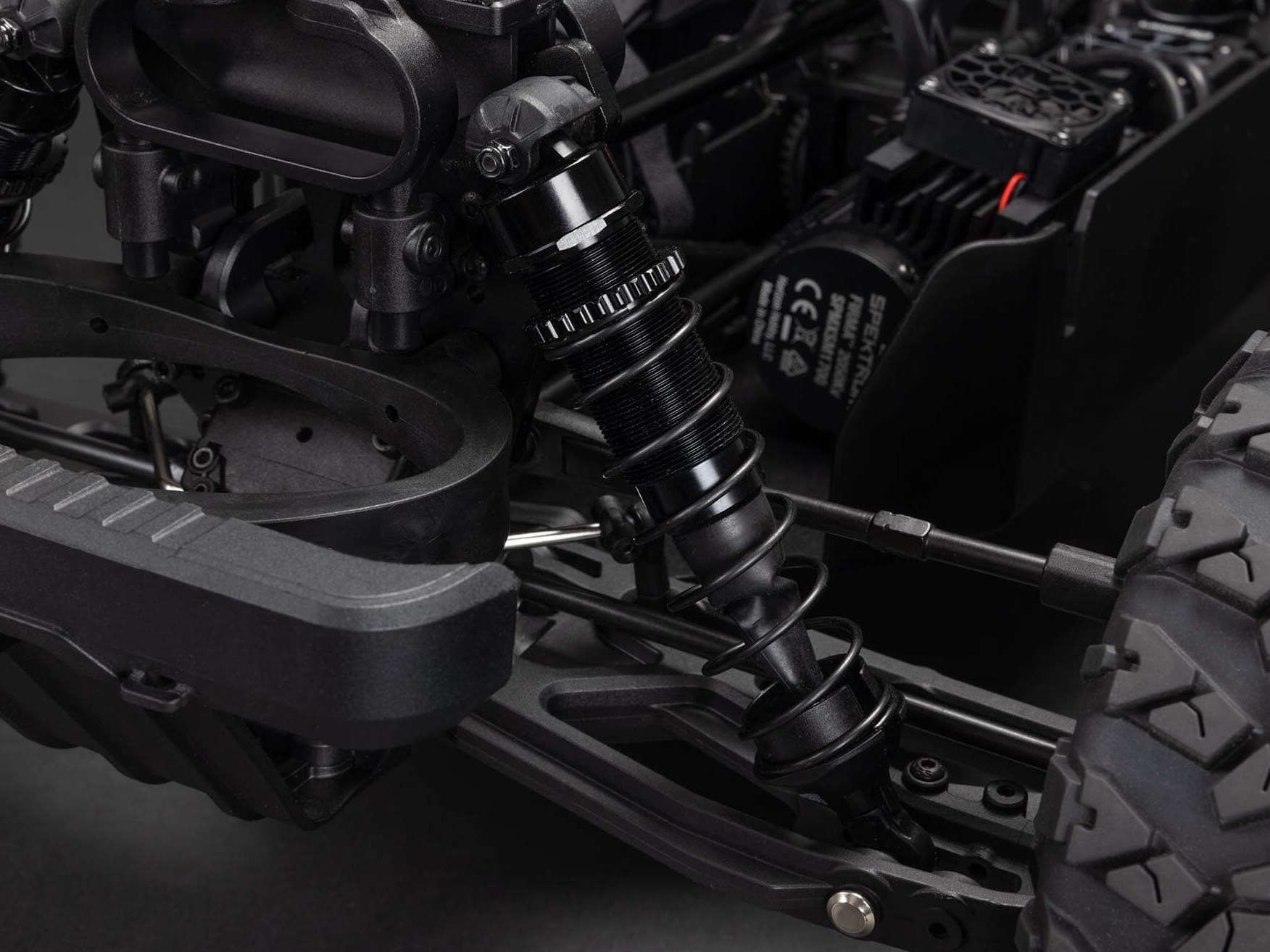 The adjustable, oil-filled shocks have black-anodized aluminium bodies and are mounted on black-anodized aluminium front and rear shock towers. The shocks keep the tyres firmly planted for high traction and provide smooth travel over rough off-road terrain.