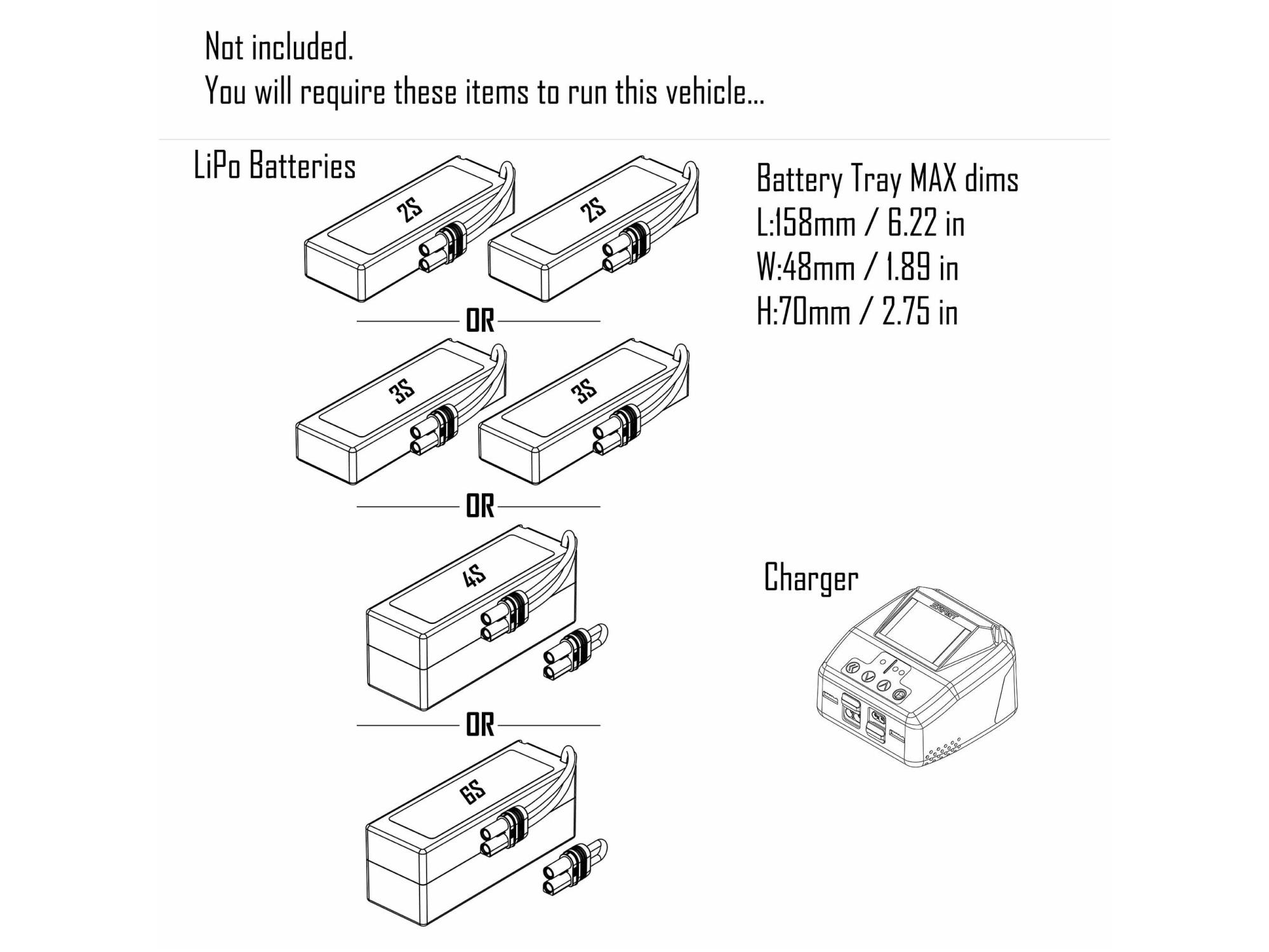 - 2 x 2S, 2 x 3S, 1 x 4S, or 1 x 6S Hardcase LiPo Battery