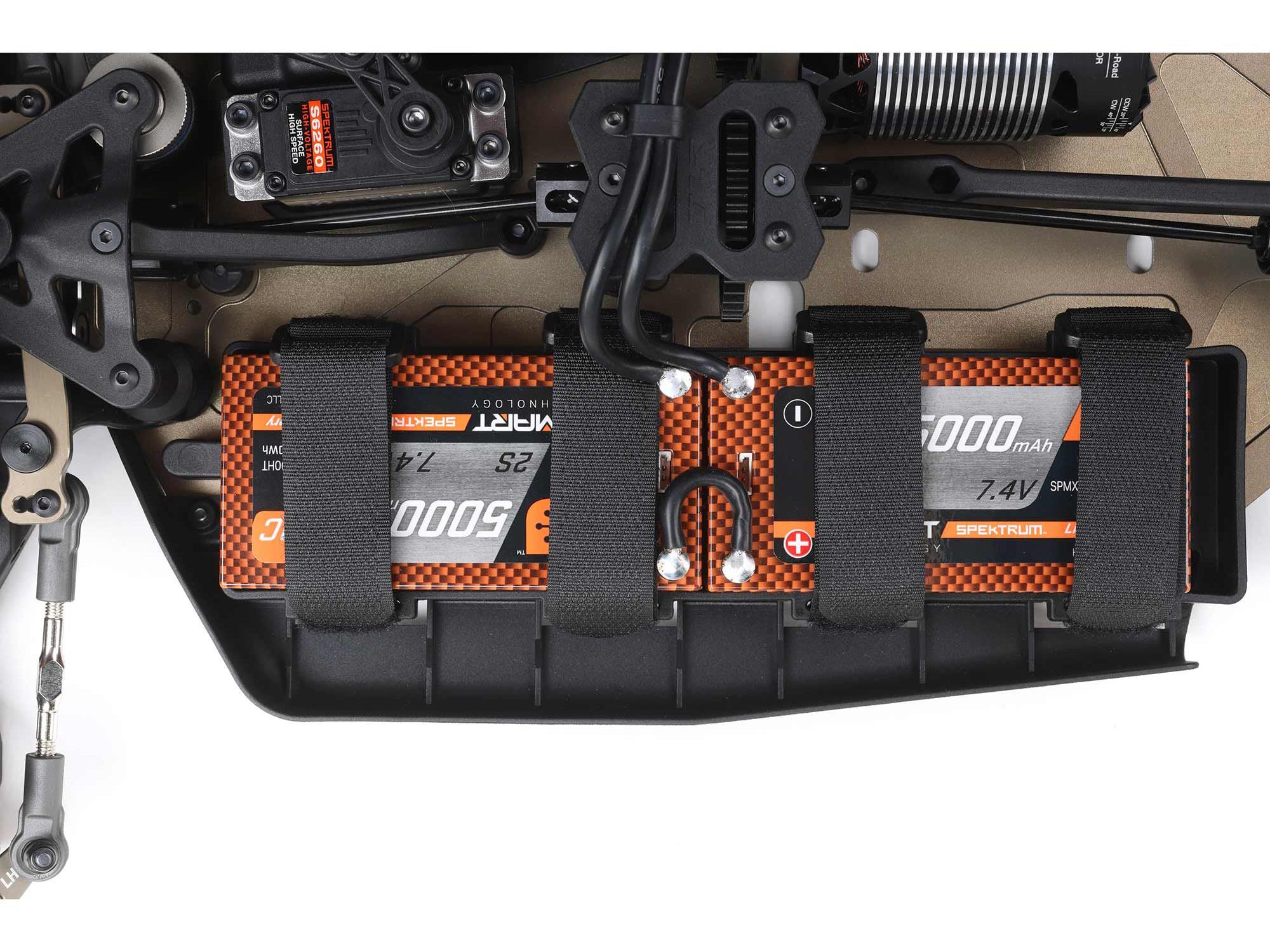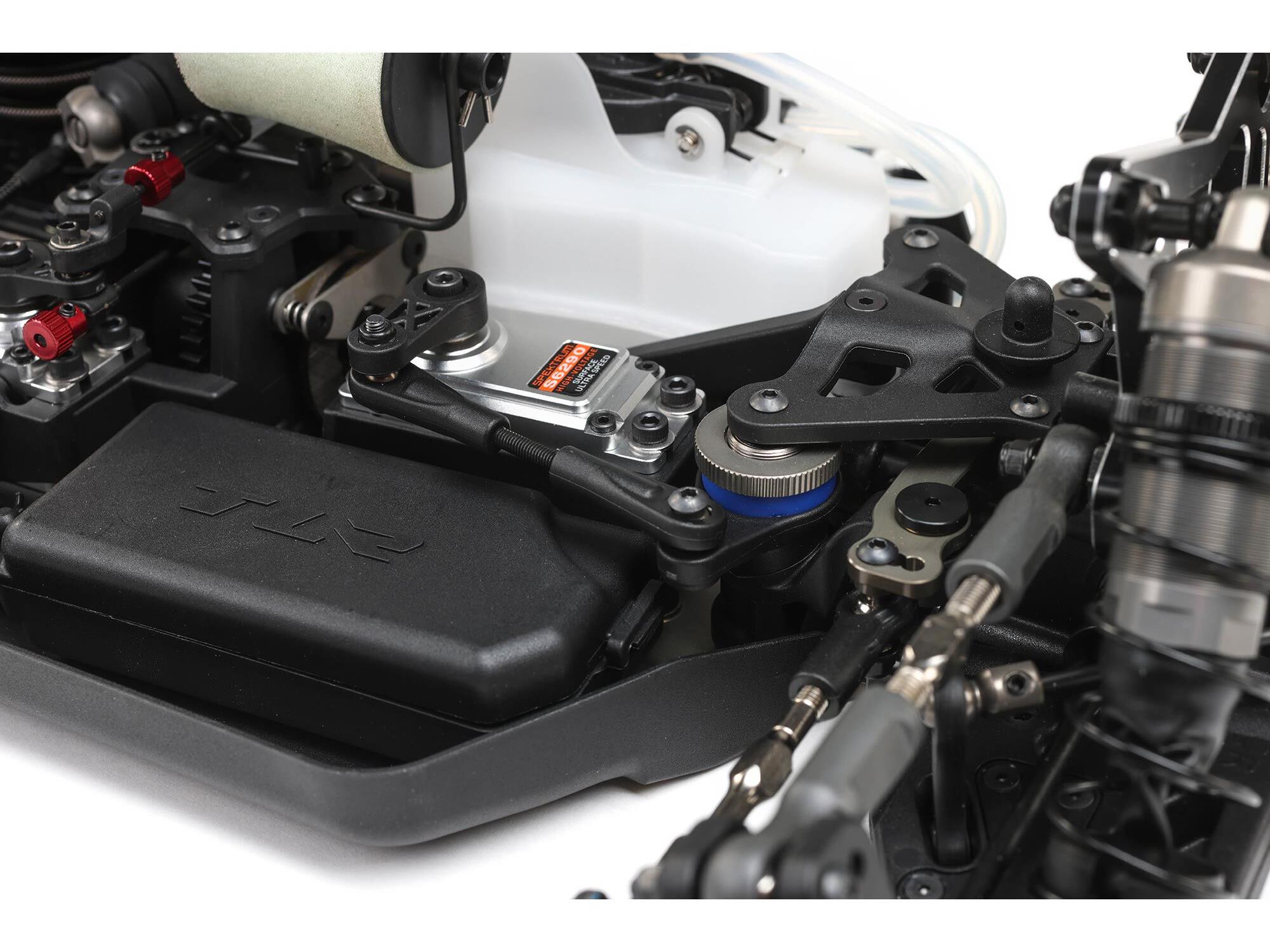 The steering servo has been moved in and forward to provide a better balance to the car. For the E version, the updated steering servo mount has an integrated ESC mount to get the ESC forward in the car.