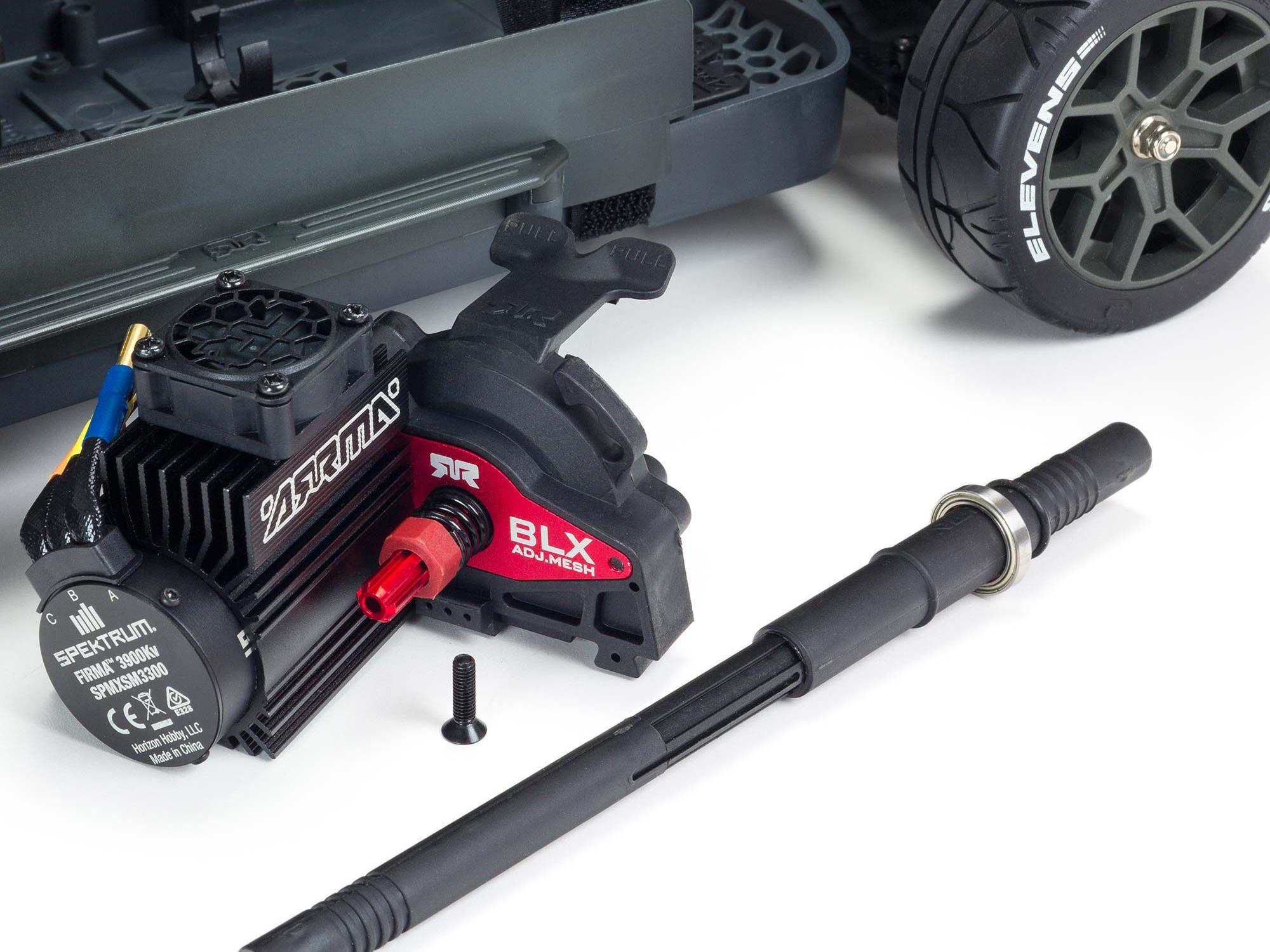 The INFRACTION® 4X4 3S BLX also benefits from the exclusive control advantages of included and installed Spektrum electronics. The DX3 DSMR® 2.4GHz radio system, SR6200A receiver, and Firma™ 100A ESC work together to provide the benefits of AVC® (Active Vehicle Control™) and Smart technology straight out of the box.