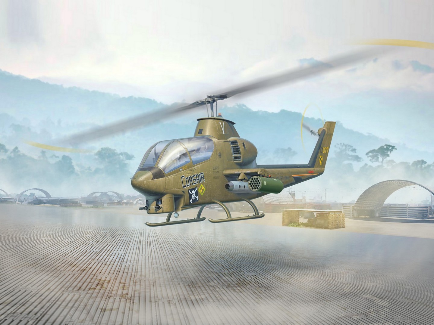 - AH-1G helicopter with a set of aviation weapons and M8A1 US landing mat