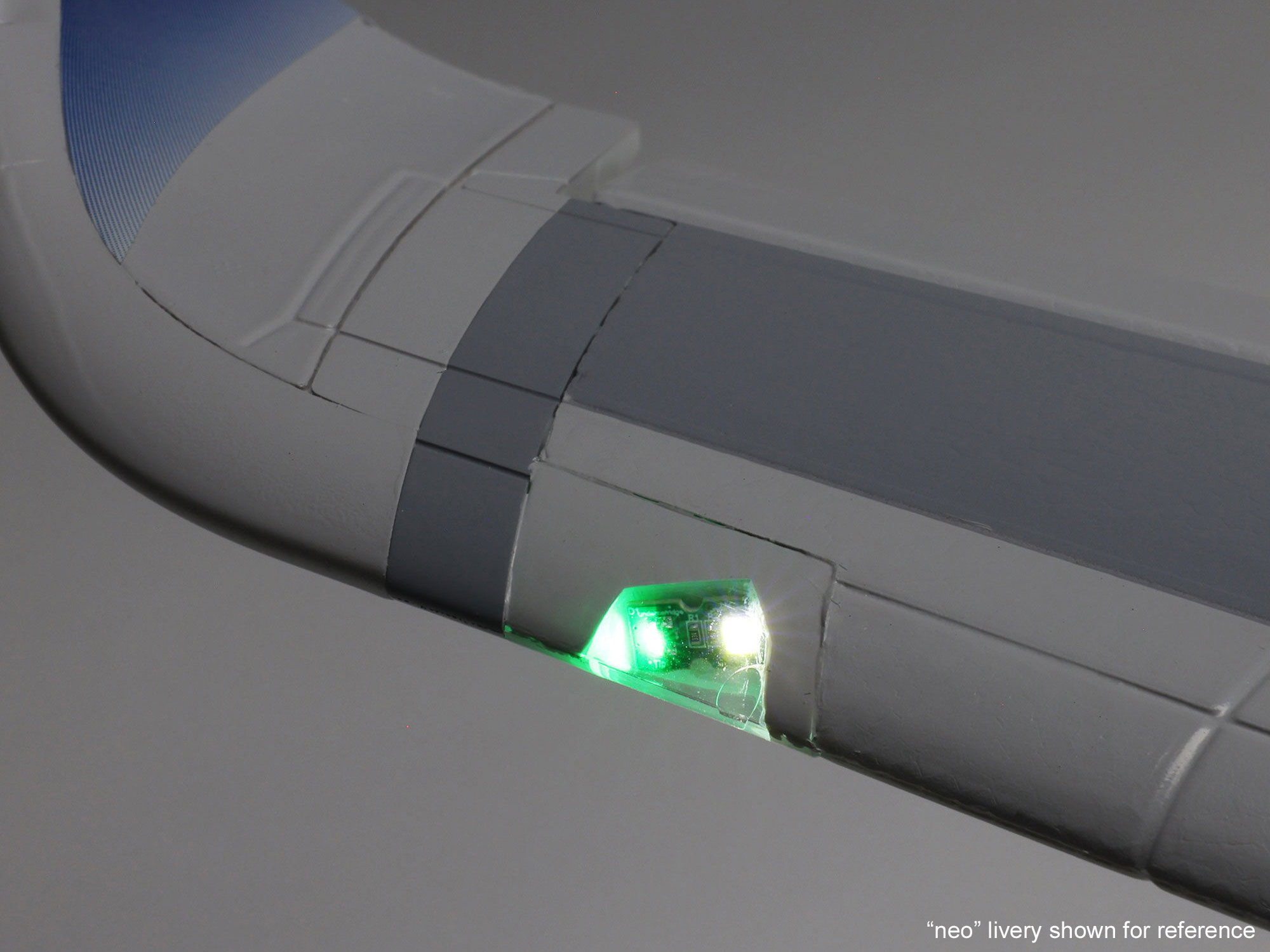 The large top hatch and opening have plastic-capped edges for improved durability to prevent damage and paint chipping when installing/removing batteries. Eight factory-installed digital and metal-geared servos with ball-link equipped linkages deliver precise and reliable control at every speed. Functional features include LED navigation, strobe and landing lights, operational flaps, and electric retracts with shock-absorbing struts so you can fly from a variety of paved, fabric, packed dirt, or grass surfaces. Various moulded details, functional nose gear doors, and flaps add to the incredible scale looks and experience. It all adds up to deliver an airliner model sized for easier storage and transport while offering an unmatched flying experience you’ll enjoy flight after flight!