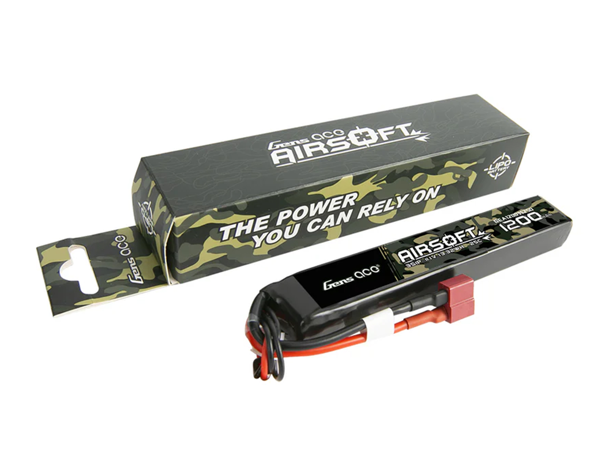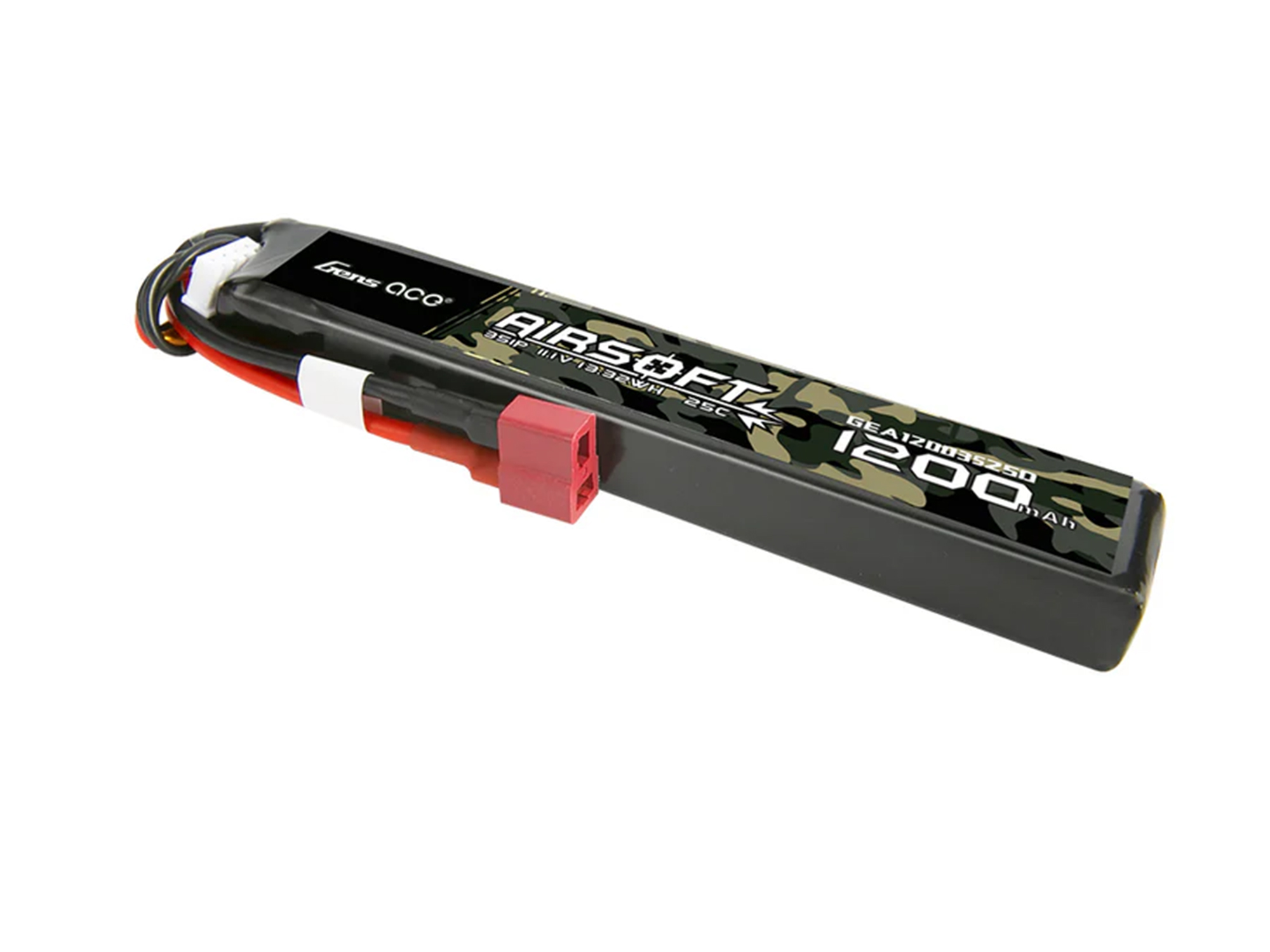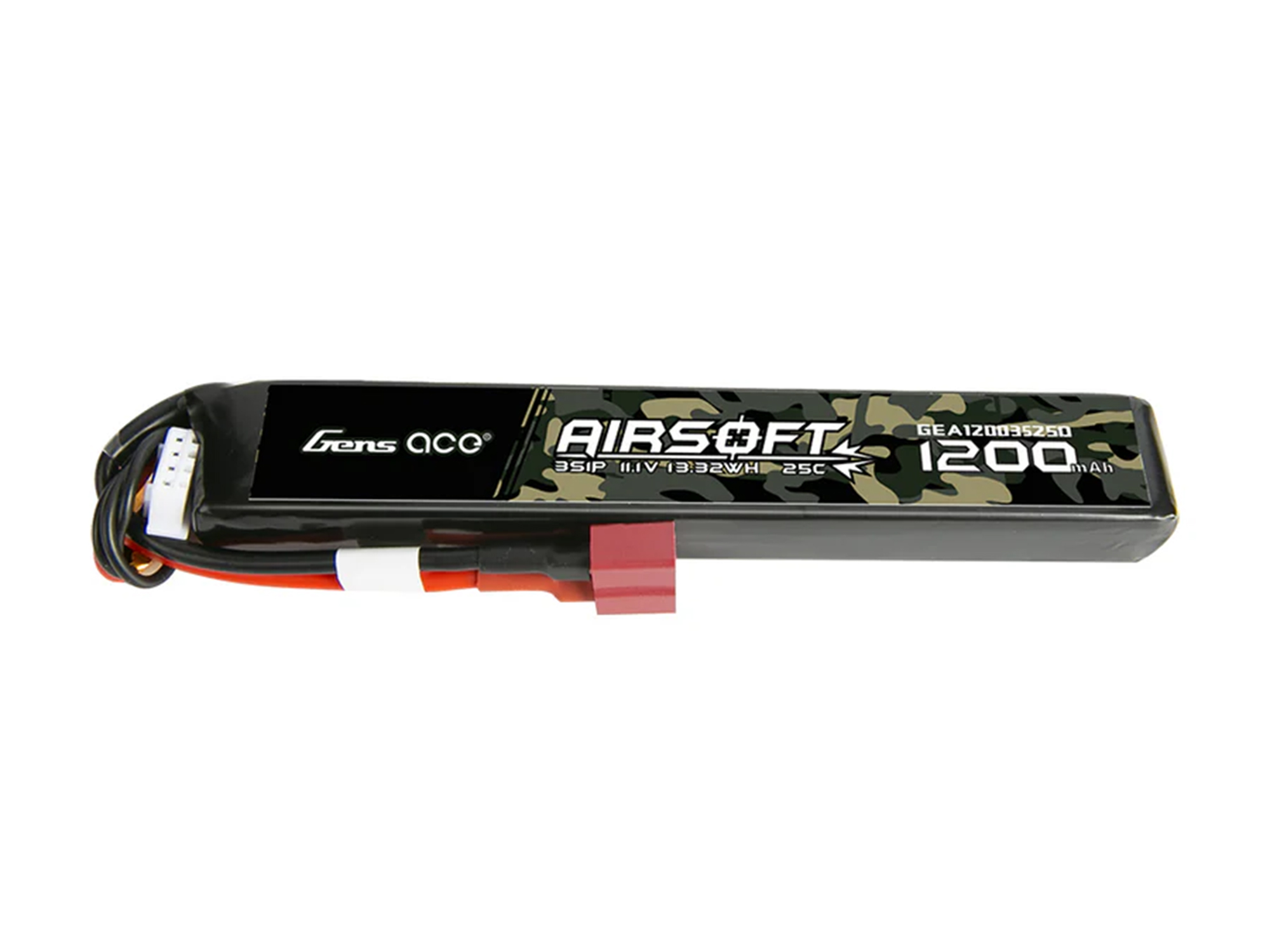 Gens ace 25C 1200mAh 3S1P 11.1V Airsoft Gun Lipo Battery with T Plug is designed specifically to power airsoft gun. Suitable for buffer tubes and AEG’s where battery space is limited without sacrificing power and fits for LE stock like M4 etc .