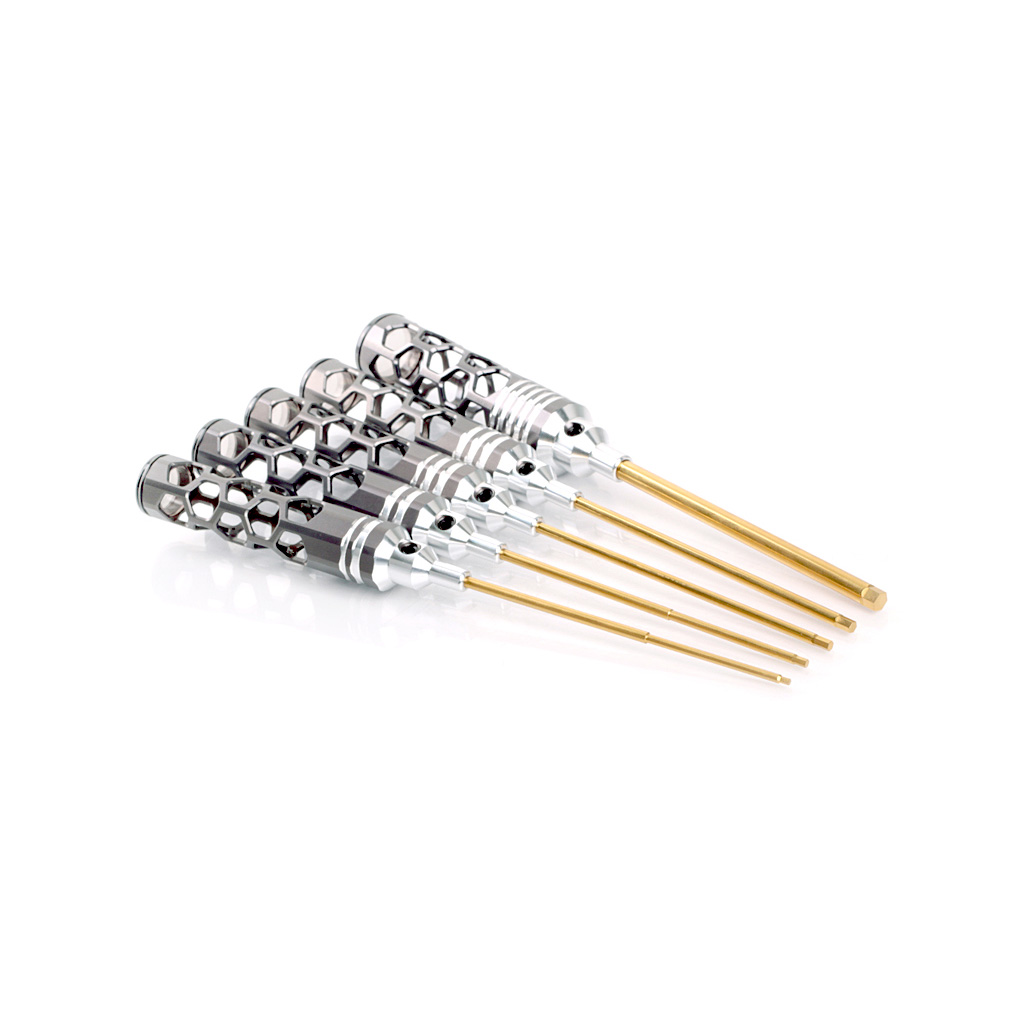 A sharp metal titanium colour anodised hollow aluminium handle, lightweight non-slip hollow, hard adodized with size indication rings. Machined special spring steel for long life and excellent torsion. Sturdy and convenient to use, the tips securely lock the screw in its place. Amuninium handle end caps, that rotate in the palm of your hand for comfort and control. Inch and metric hex and ball hex drivers. Inch and metric socket drivers.