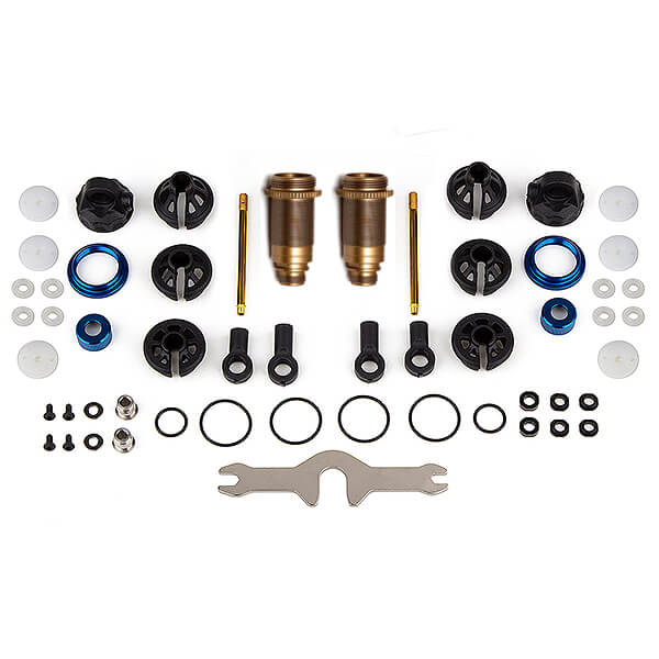 Use these complete shock kits to upgrade your RTR. Featuring hard anodized threaded bodies, machined Delrin® pistons, TiN-coated shafts, and low-friction X-Rings, these shock kits will transform the performance and look of your DR10, SR10, RB10, or any other compatible vehicle. Team Associated’s proven race shock construction ensures a leak-free, silky smooth operating shock, time after time. These 12mm complete shock kits can replace your stock RTR shocks. Kits contain parts for two shocks. Springs are not included.