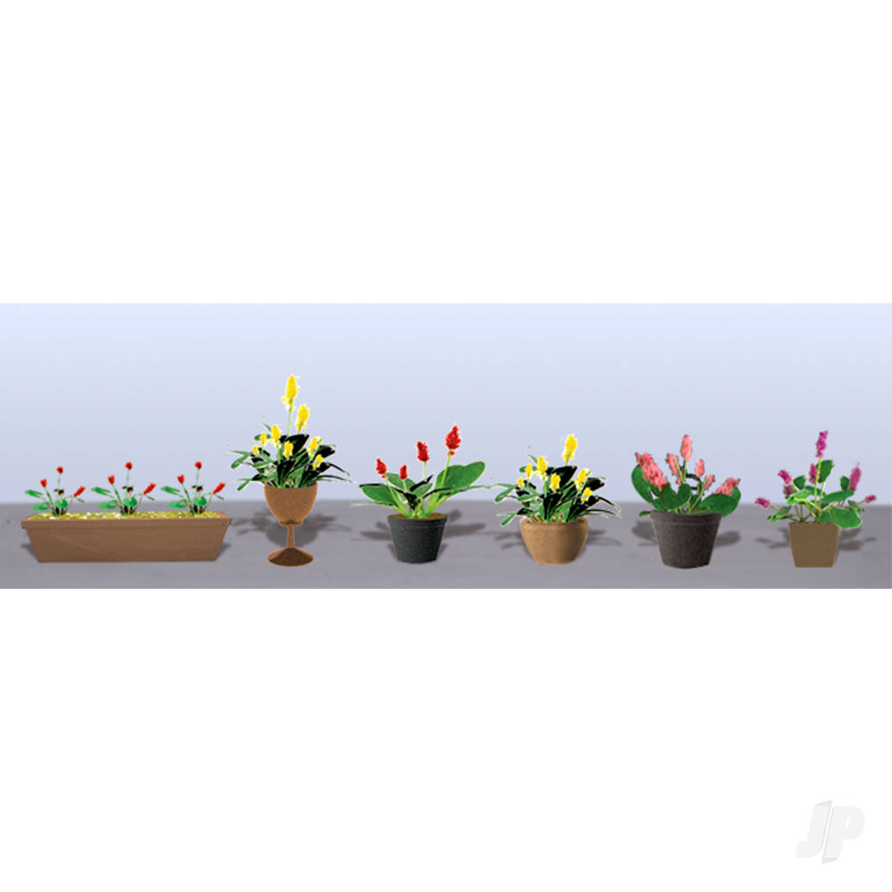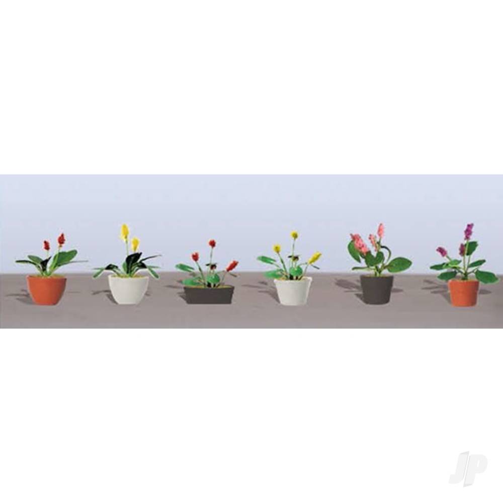 These potted flowers brighten any scene. The plant in each pot was specifically chosen to complement the shape and colour of the container. Have a dollhouse? Put a few pots in or outside the windows. Planting a garden? Form a perimeter with these decorative pots. Anywhere you use them they’ll brighten your layout.