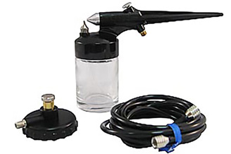 This gun is perfect for jobs requiring large overall coverage with medium to heavy viscosity materials. Modelling, school projects, home improvement projects, workshop jobs, ceramic underglazing, fogging, texturing and stencilling can all be handled by the Model 250. The spray pattern can be adjusted fro 3/4″ (19mm) to 2″ (50.8mm) simply by turning the paint tip. The model 250 uses 3/4 oz. (22ml) or 2 oz (60ml) jars.