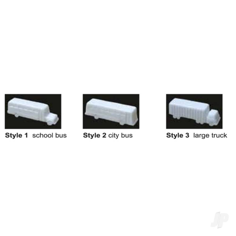 JTT’s white styrene plastic vehicles come in varied shapes, including trucks, buses, vans, pickup trucks and more. They are ideal for architectural models and ready for painting. HO-scale, 1/8th (1:100), 1 bag, 3/pk.