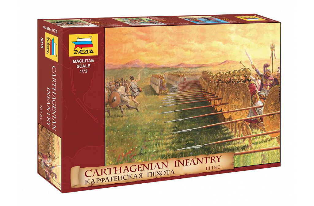 This Zvezda set includes forty-two figures made up of eleven different models. These Carthaginian Infantry figures are primarily made up of hoplite-style soldiers with long spears and round shields (the Carthaginians were not averse to equipping themselves with the arms and armour of their fallen enemies). There are also figures with gladius swords and round shields, as well as a standard-bearer, and a trumpet player.