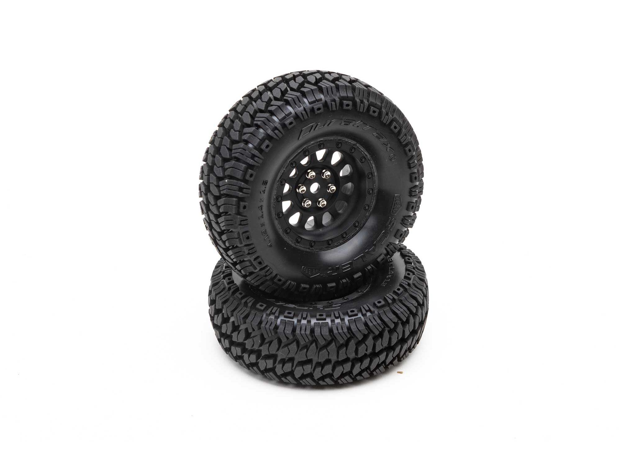 These Duratrax® SCALER front and rear tires are Class 1 (4.19" outer diameter) size for maximum scale appearance, with a 1.9" inner tire/outer wheel diameter. Made from super-soft C3 compound rubber with an aggressive tread that bites into loose or muddy surfaces, these tires provide exceptional gripping power for climbing over slippery rocks and getting past the toughest obstacles. They include foam inserts and arrive factory-mounted to 12mm hex wheels that are molded from a durable black composite plastic. Sold in pairs.