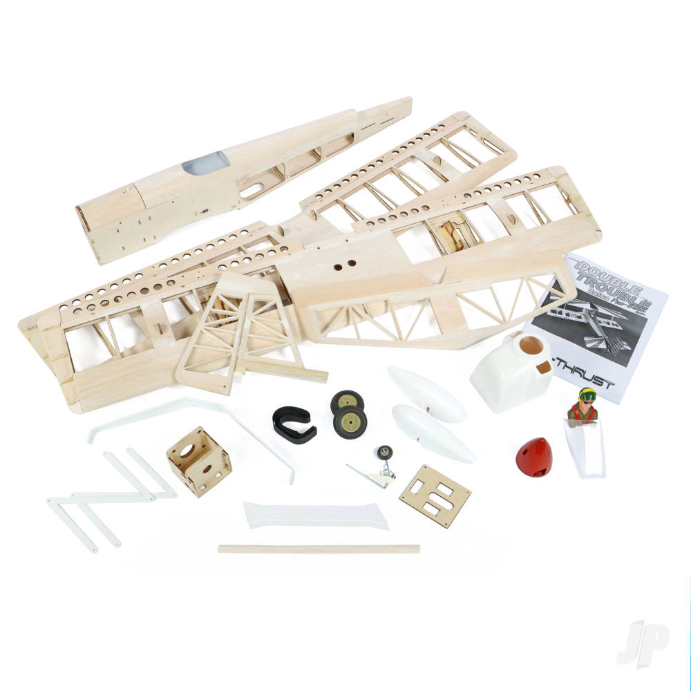 Fly it like you stole it and dont look back! Thats good advice for owners of the performance-proven Double Trouble Balsa Ready-to-Cover bipe. Sporting sharp, modern Ultimate-style design traits with a nod to open-cockpit classics such as the Pitts, Skybolt and Stampe, the Double Trouble offers an impressive full-house aerobatic capability along with superb slow-speed characteristics and outstanding ground handling. With all this wrapped in a one-piece model thatll go in the back of a small car, you can see why pilots navigate towards it when they have an aerobatic itch to scratch.