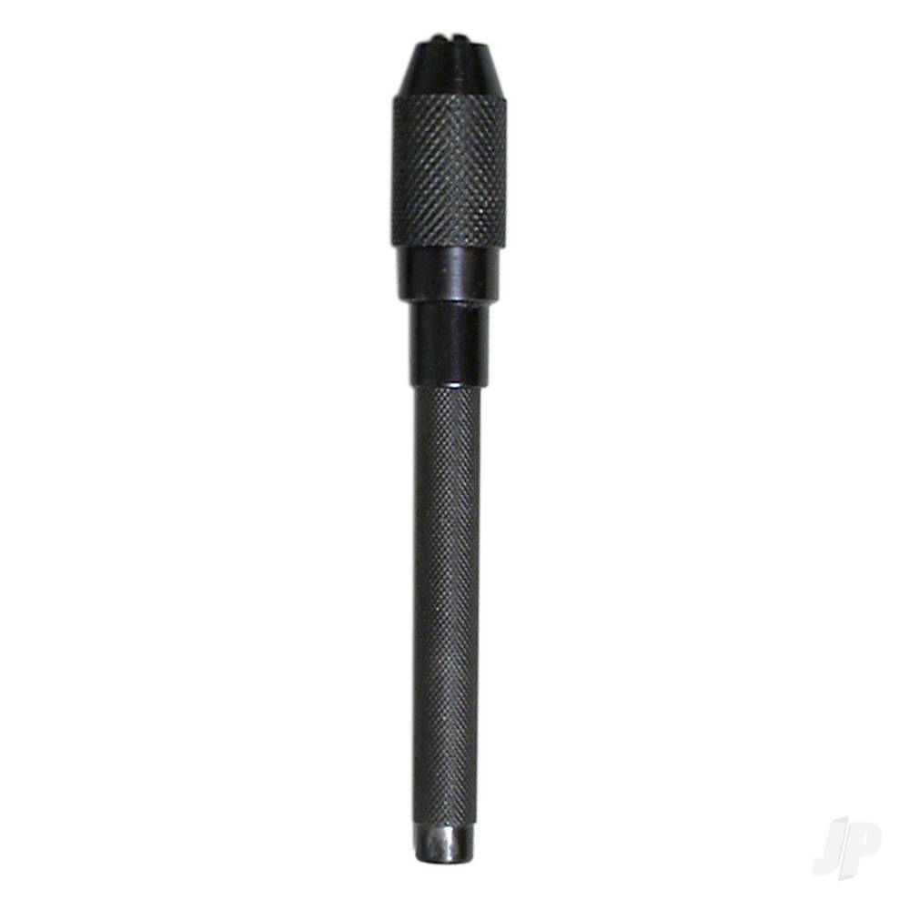 A single ended pin vice to holding smaller diameter HSS drills. Use to slowly drill tiny holes in plastic, styrene etc. by hand with great control and precision. Railway modellers use this tool to drill holes for handrail wire and is useful for holding taps.