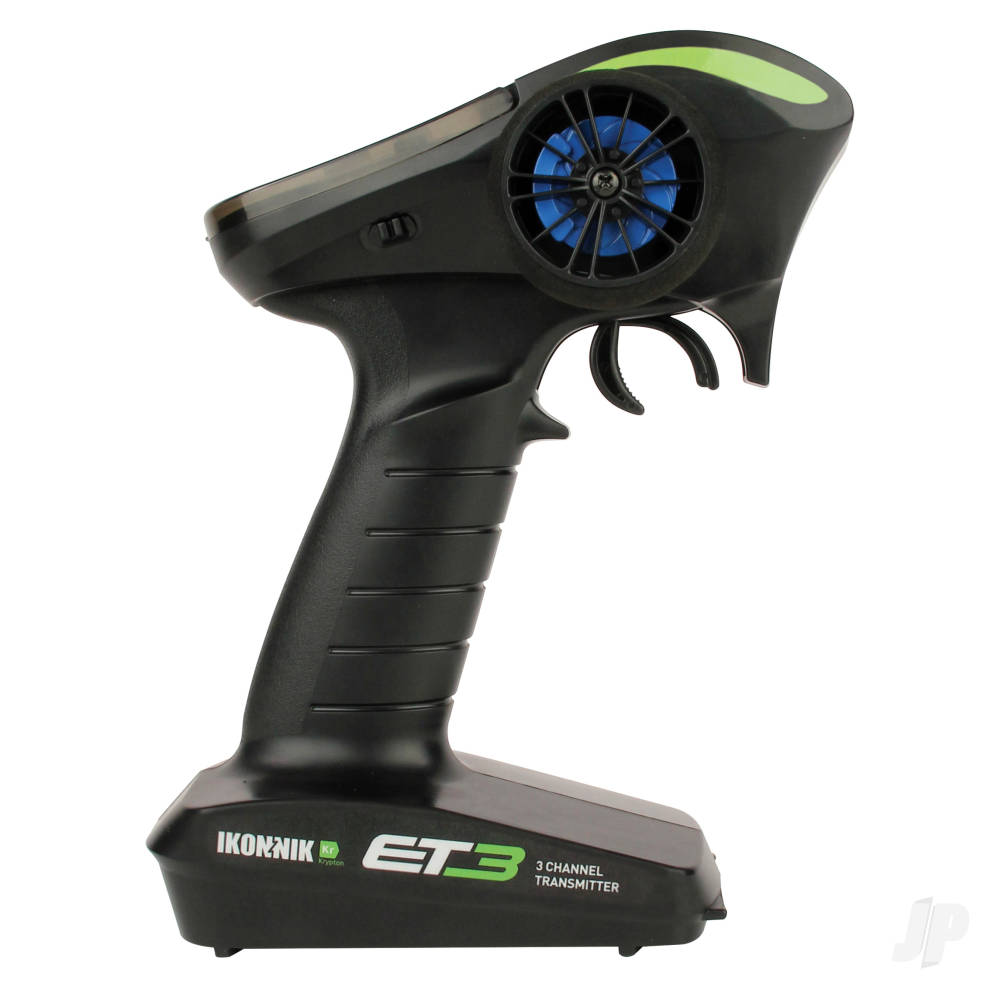 The IKONNIK ET3 is a user-friendly 2.4GHz radio system that offers three channel operation – two proportional channels for steering and throttle, and a handy switched third channel to control auxiliary functions or accessories. The transmitter fits the hand perfectly and with just four AA batteries it weighs very little, making it comfortable for longer races. Perfect for the newcomer and intermediate level drivers, the ET3 has many innovative features such as an internal antenna and a charging jack (for upgrading to rechargeable battery operation). As standard it includes end point adjustment on the throttle channel, a PPM output socket, steering dual rate and digital trim, plus servo reverse on steering and throttle. The protocol is IKONNIK Krypton, so it’s compatible with all other Helion vehicles that have Krypton inside. Supplied with a 3-channel all-weather IKONNIK Krypton receiver.