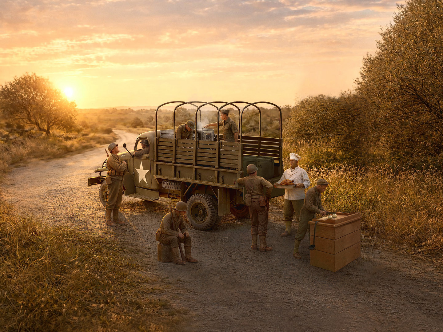 - Four U.S. Army cooks from WWII, three infantrymen, a driver, and a Kitchen Truck based on the G7117 vehicle