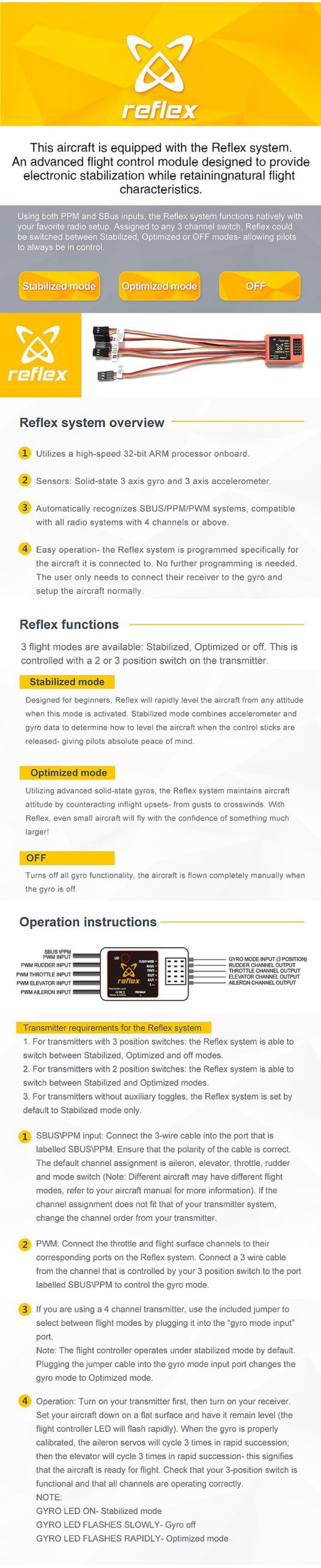 Reflex V3, an onboard flight stabilization system, is factory installed. The Reflex system features Stabilized, Optimized and Manual flight modes. Reflex V3 is a trusty co-pilot that is perfect for pilots of any skill level.