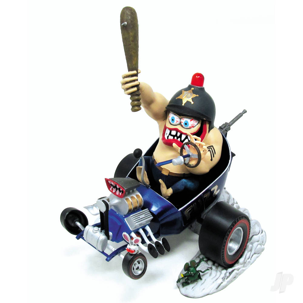 Superfuzz Fred Flypogger himself as a happy friendly lawman. Dig him with his drool in his supercharged prowl car, complete with persuader, machine gun and handcuffed culprit, but still looking for bad guys. This humorous figure stands 6 1/2 inches high with ‘gumball machine’ helmet, exhaust smoke cloud, and the little signature Mouse up front. Eyes can be positioned anywhere to change expression.
