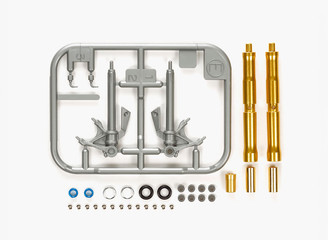 Add an extra layer of realism to the already-stunning 1/12 Ducati 1199 Panigale S model with this detail-up parts set. It features gold-colour anodized parts to recreate outer tubes and the oil damper reservoir tank, plus blue fork top parts, black anodized outer tube end parts, and even minute aluminium pieces to depict the floating pins on the brake discs. The inner tube is also recreated using gold coloured metal-plated brass for highly authentic visuals. Plastic parts are included to capture the fork bottoms and wires