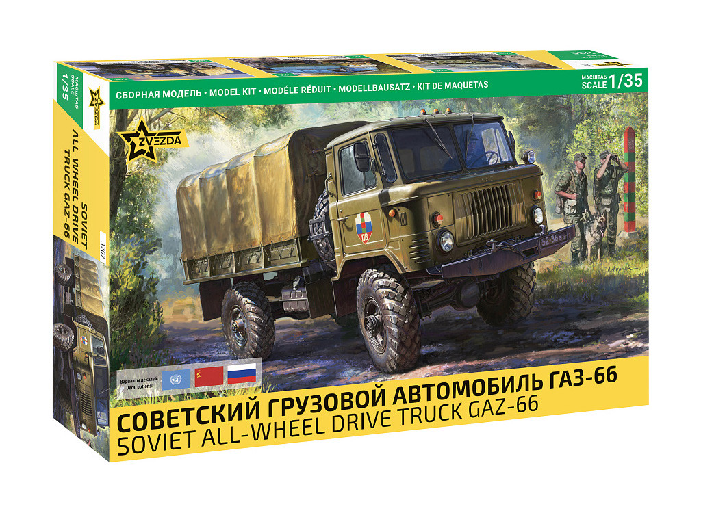 The Soviet all-wheel driven truck GAZ-66 was created by engineers of the Gorky Automobile Plant for the needs of the Soviet Army and the domestic market. The first trucks were assembled in 1964. The people nicknamed this car “Shishiga”. GAZ-66 can carry up to 2 tons of cargo in difficult road conditions. The maximum speed on the highway is 90 km / h. Good cross-country ability is achieved due to the uniform load on the axles, adjustable tire pressure and the use of cam differentials on the front and rear axles, and high ground clearance. During operation, the truck was repeatedly modernized. The GAZ-66-11 modification went into production in 1985. The car received a central tire pressure regulation system and modern lighting equipment. In 1993, a new universal cargo platform without wheel arches, with increased internal dimensions, was installed. This latest version of “Shishiga” is depicted in our model.