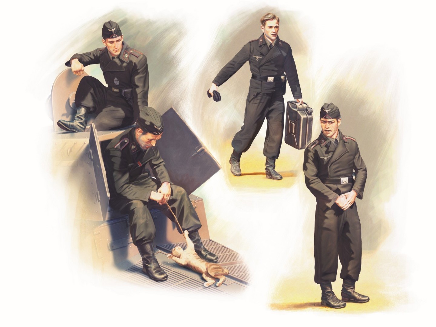 Set of four detailed German Armoured Vehicle Crew figures in 1:35 scale made up of 32 parts. This plastic model assembly kit is ideal for someone wanting to recreate and paint their own German army figures for dioramas (the figures depict four tank crewmen, as well as a small cat figure). Details include period correct uniforms for the different figures.