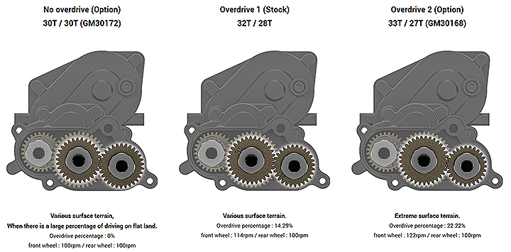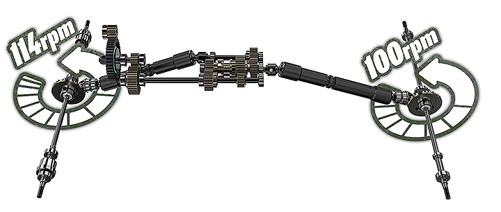 The GS02F transmission is designed to rotate the front wheel faster than the rear wheel.