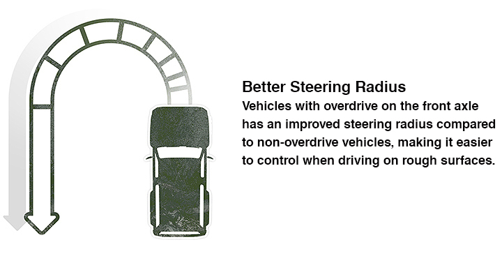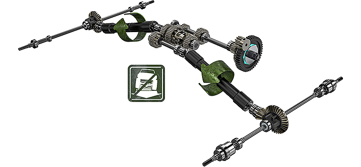The GA44 axle is using Zero-ackerman steering system with CVA to ensure maximum performance with a short turn radius and smooth motion even on rough off-road terrain.