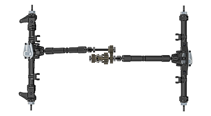 The front and rear universal shafts based on the transmitter each rotates clockwise and counterclockwise, this compensates for the forces acting on the opposite rotational forces due to the action(torque) and reaction(reverse torque) because of that this vehicle can run in a super stable conditions