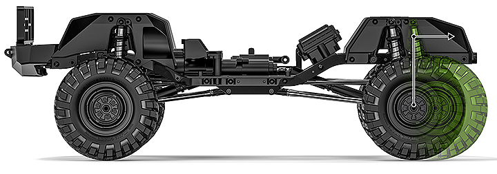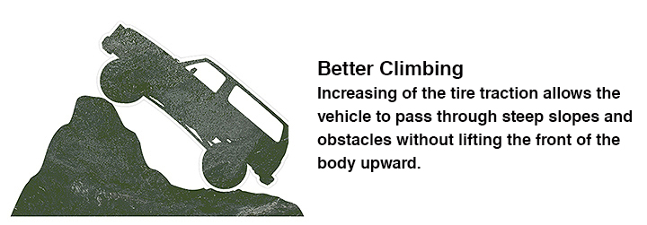This will increase the tire tracktion to the front wheel to provide better crawling on a high tilt angle rocks and better driving performance when hill climbing and this will help minimizing the vehicle’s rolling over when climbing.