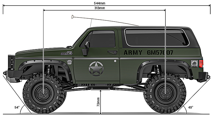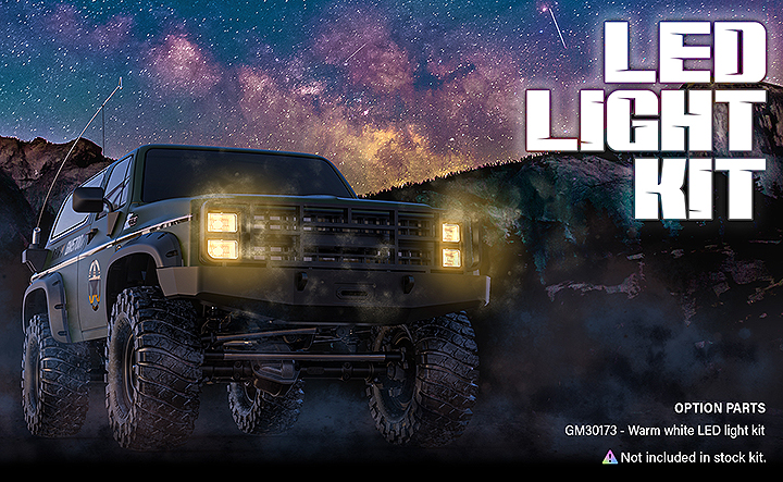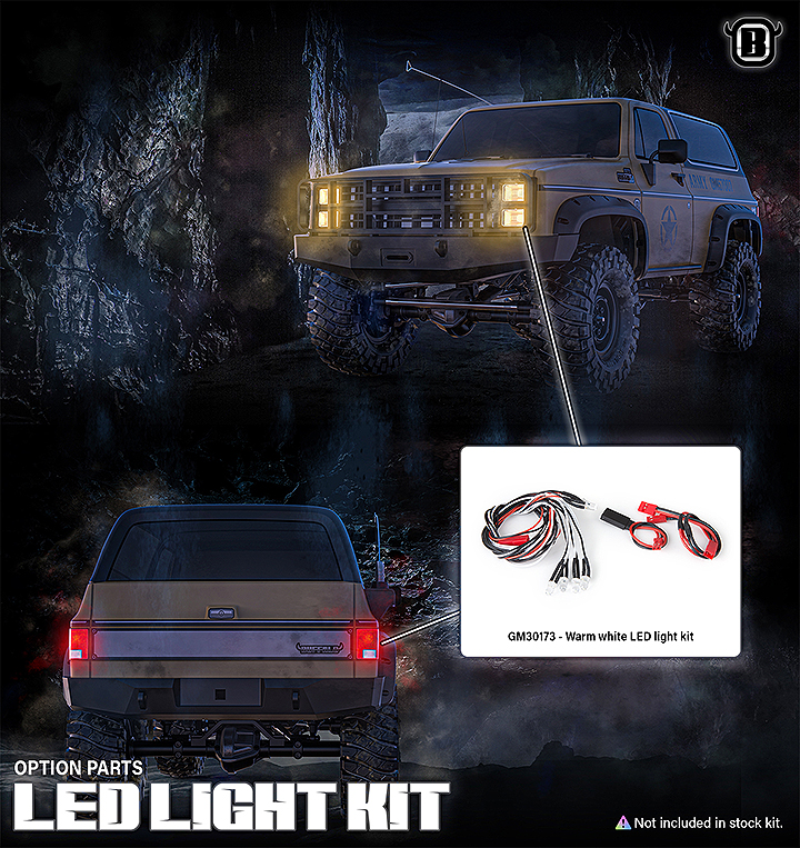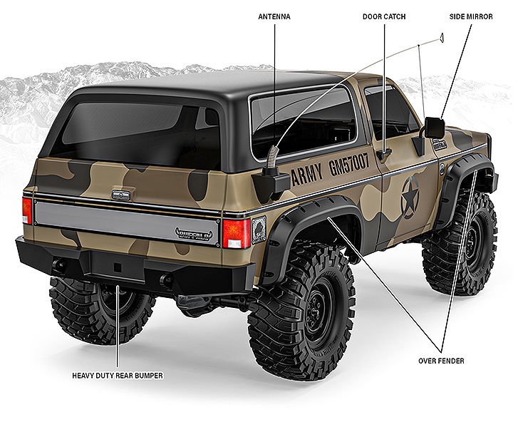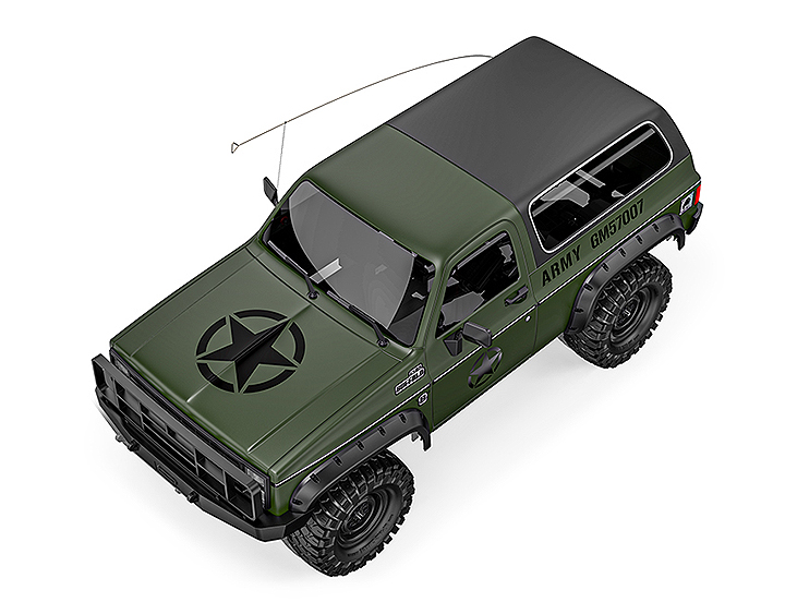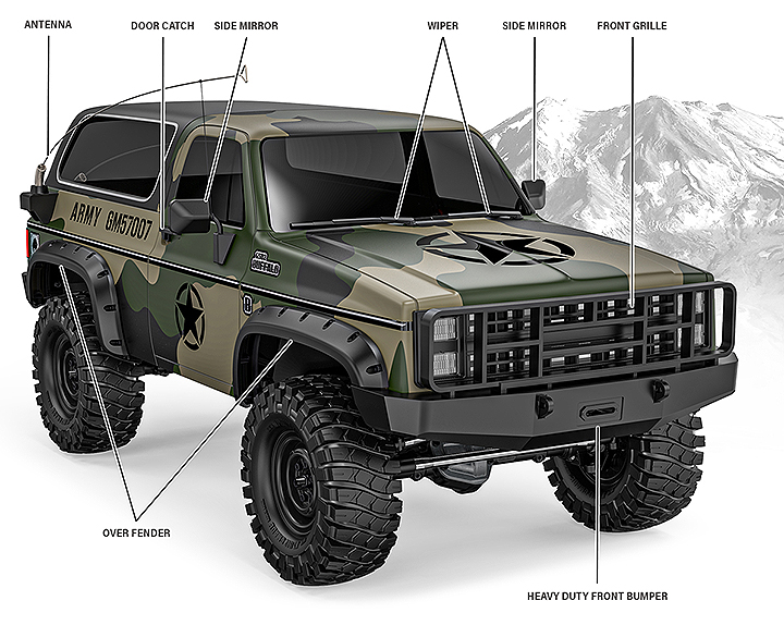To add realism details it includes front grille, light bucket, side mirrors, wipers, door handles, overfenders and a roof rack & LED light bar so you can tune into a realistic off-road vehicle to matches the concept of off-road adventure.