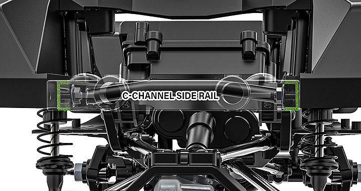 GS02F frame is designed to look as a chassis of a real car frame and the material of the frame is made of high strength steel, C-channel side rail and is with hex wrench bolted with cross members, which make it resistant to twisting or wraping. Also, steel parts are black powder coated finish to prevent rust.