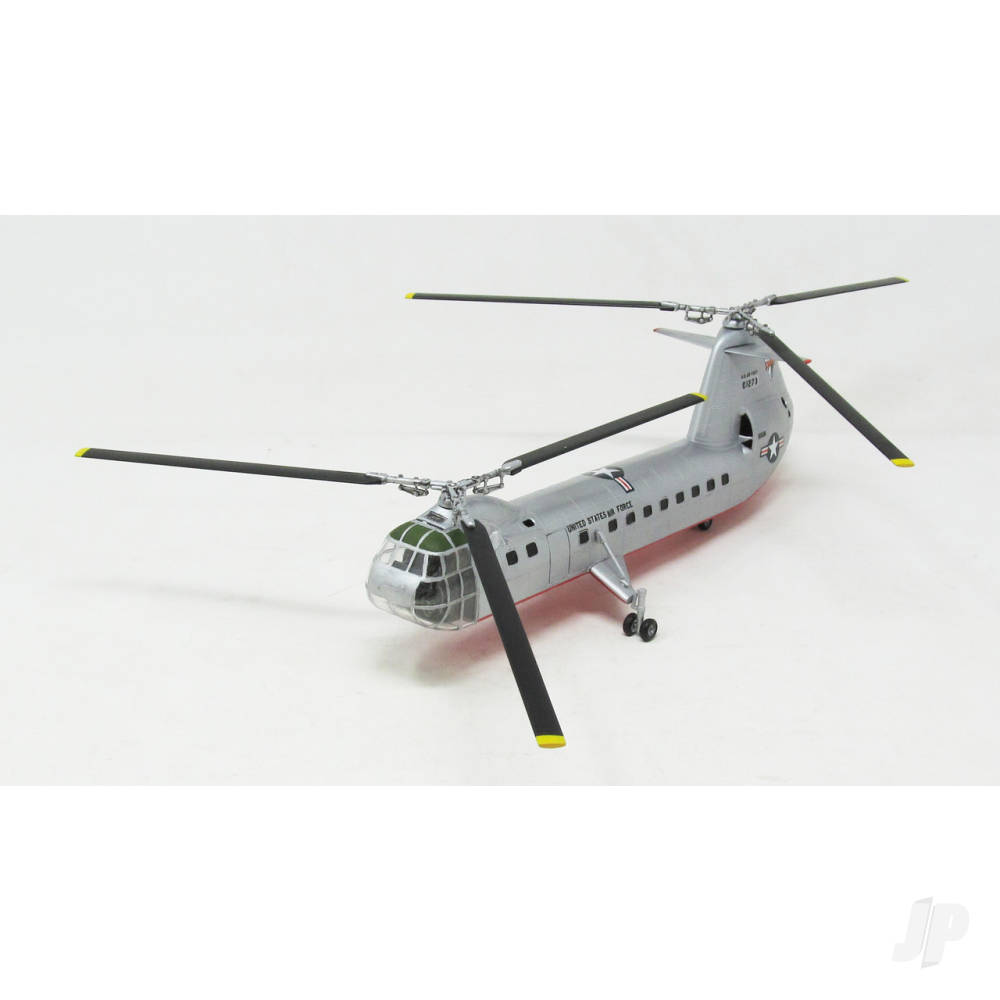 1:96 Scale. Measures 9.75 inches long. Features movable rotors and operating cargo door. Includes swivel display stand and collectible trading card. Comes moulded in silver, clear with decals and instructions.