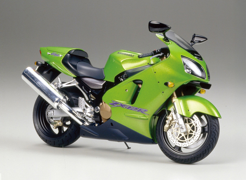 Kawasaki’s legacy of cutting-edge sportbikes has inspired motorcycle fans for generations. Recently, the call for 300km/h plus super sports bikes has motivated several manufactures to bring out powerful contenders. Kawasaki answered the call at the 1999 Paris Motorcycle Show, with the impressive debut of their all-new Ninja ZX-12R. This Ninja was reportedly created in the image of a fighter plane, which comes as no surprise considering that its slippery aerodynamics involved the cooperation of the Aerospace Division of Kawasaki Heavy Industries, Ltd. In fact, the ZX-12R spent more time in the wind tunnel during its development phase than any motorcycle in Kawasaki’s history. The results are evident: small winglets on the sides of the fairing separate airflow around the bike; small wind deflectors on the lower forks deflect turbulent air from the engine; a long lip on the edge of the fairing further smoothens out airflow. Also, projecting just ahead of the front fairing, a large scoop takes advantage of higher air pressure, heightening intake efficiency. A monocoque frame backbone creates an airbox that allows air to pass through the inside of the bike for cooling in addition to ensuring overall rigidity. The powerplant of the Ninja ZX-12R is a fuel injected 4-cylinder 1,199cc engine that pumps out an abundant 178hp. Its four-into-two-into-one exhaust system features a titanium muffler paired with a catalyser, which helps eliminate unburned hydrocarbons for cleaner emissions. Kawasaki brilliantly raised the superbike standard in performance, power and aerodynamics with their series flagship, the Ninja ZX-12R.