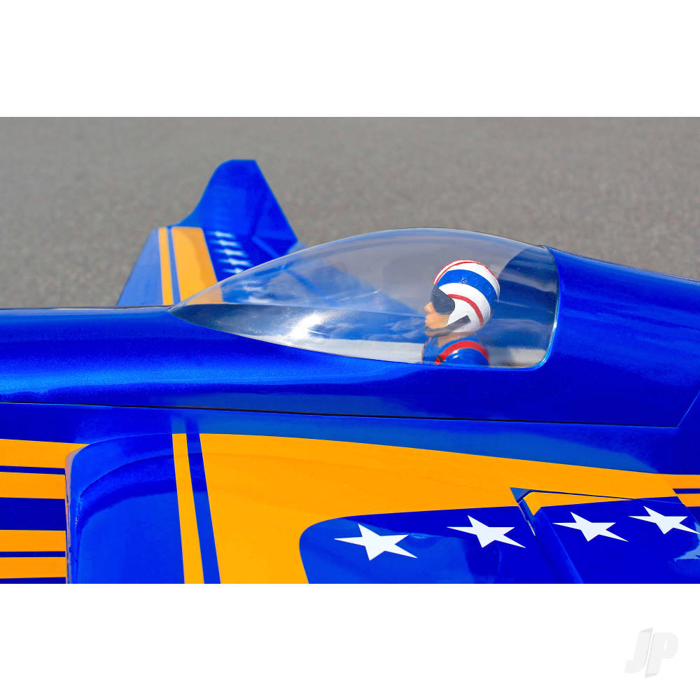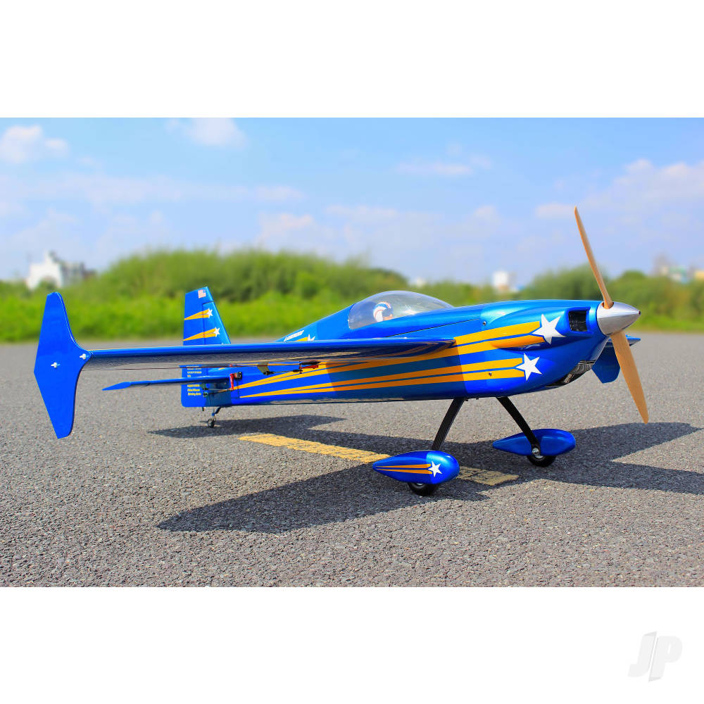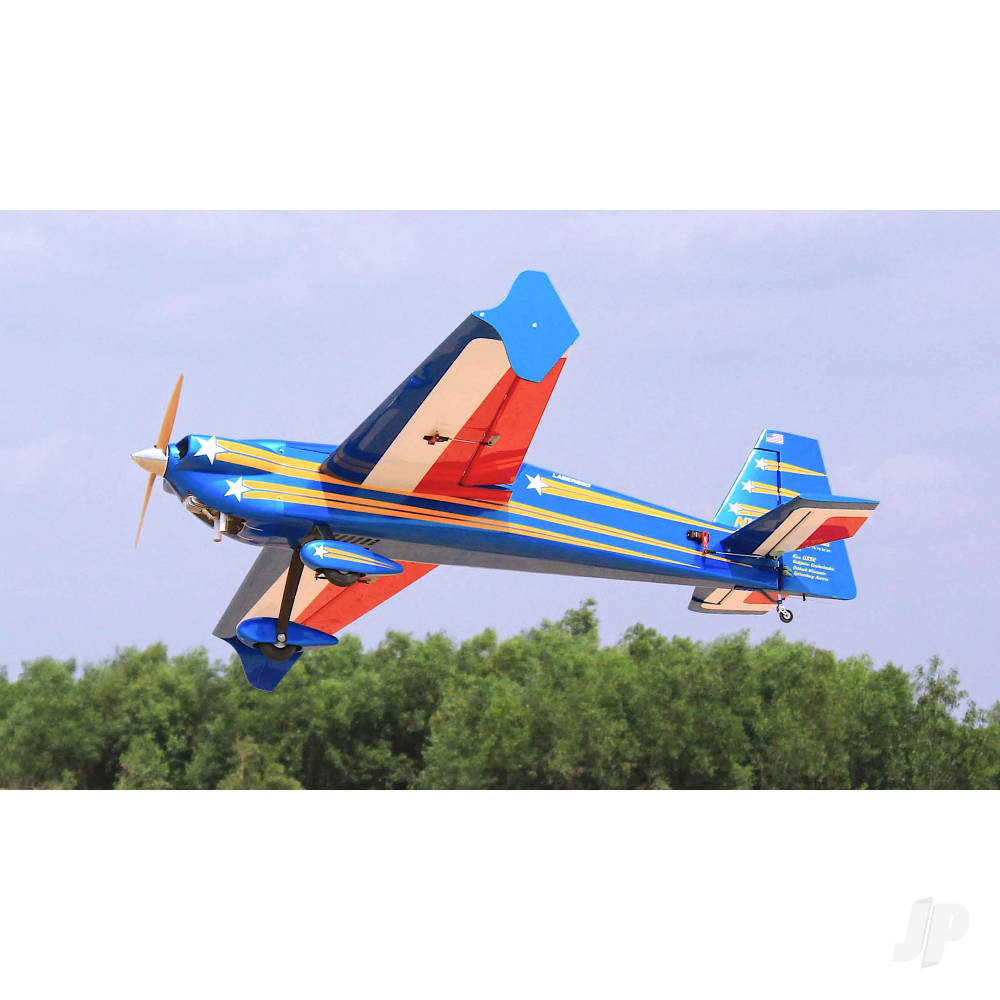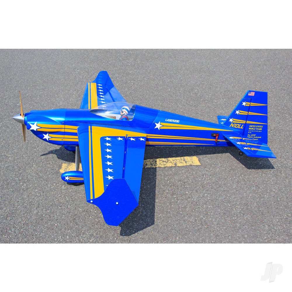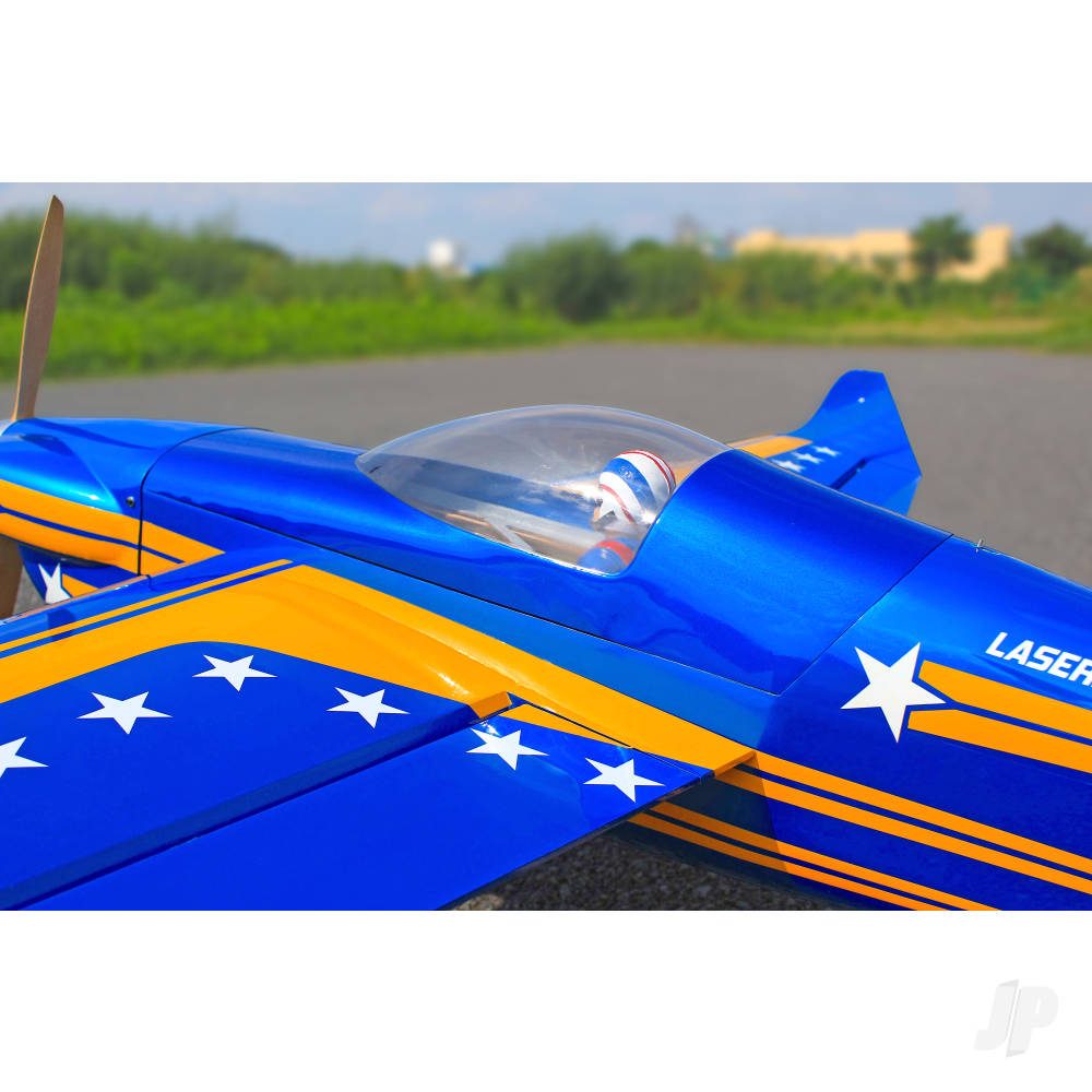 The laser features high-quality hardware, a pull-pull rudder control system, robust carbon undercarriage and a factory-painted fibreglass cowl. It’s a stunning model, designed for 3540cc petrol engines or equivalent high-power electric setups. Control authority is exceptional thanks to large surfaces, while the airframe remains stable and predictable through all the aggressive manoeuvres that youd expect it to be capable of.