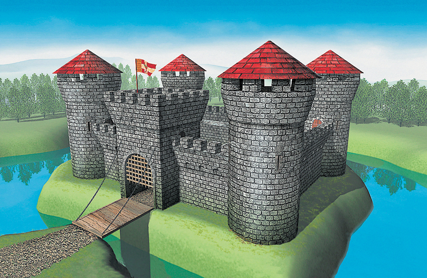 The fortress consists of 4 round towers with roof and one square tower with drawbridge and lattice. The towers are connected by 9 wall segments.