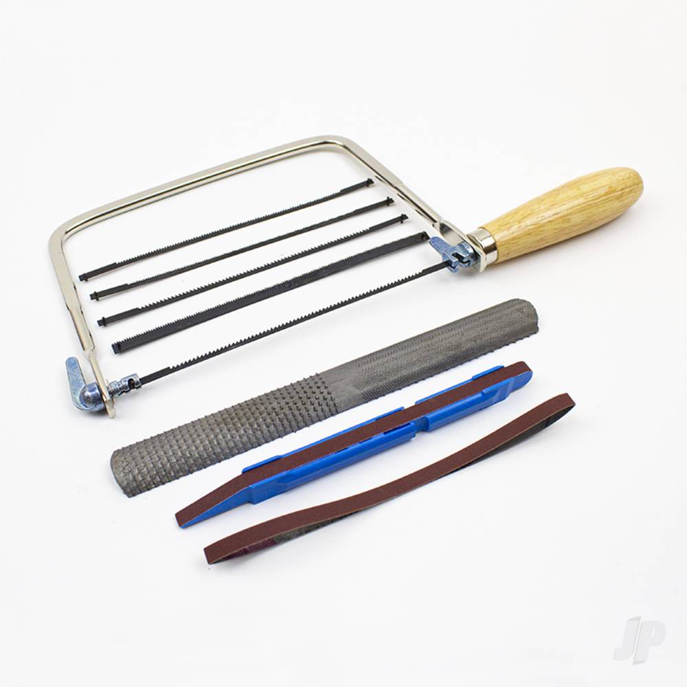 - Contains: (1) Coping Saw Handle / (2) #1 Coping Saw Blades / (1) #2 Coping Saw Blade / (1) #3 Coping Saw Blade / (1) Sanding Stick / (1) Extra Sanding Belt / (1) 4-way Hand File