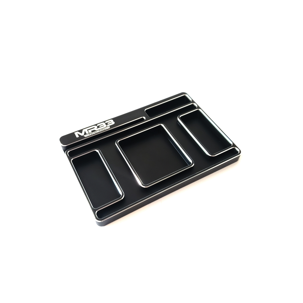 Place your setup system perfectly in your pit area on the new MR33 Setup Tool Stand. There are designated areas for the setup system, the acryl measuring plate and the setup system nuts. The tray is machined from high quality aluminum with black anodizing and a laser engraved MR33 Logo.