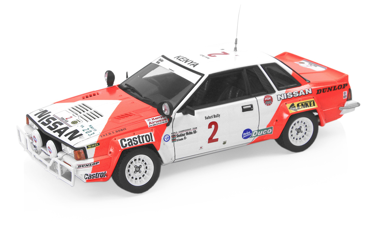 A 1:24 scale plastic assembly model kit of Nissan’s 240RS Group B World Rally Championship car. It features the classic red and white Marlboro colour scheme livery used in the Safari Rally held in Kenya in 1984. The car itself was based on the third generation Nissan Silvia S110 series notchback coupe body shell.