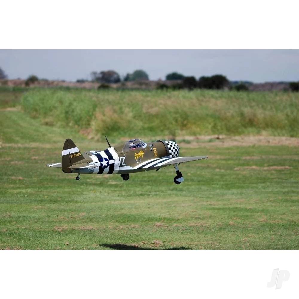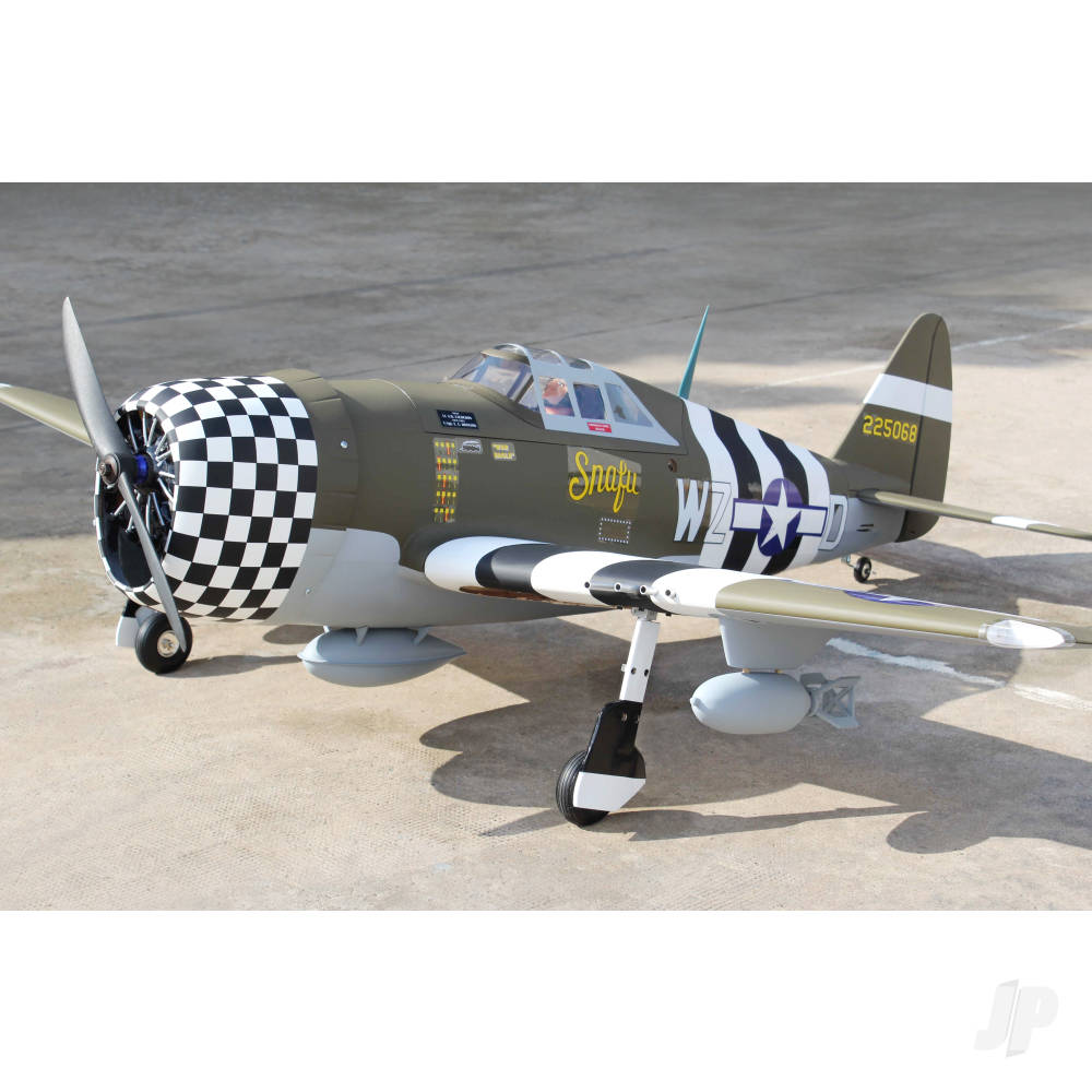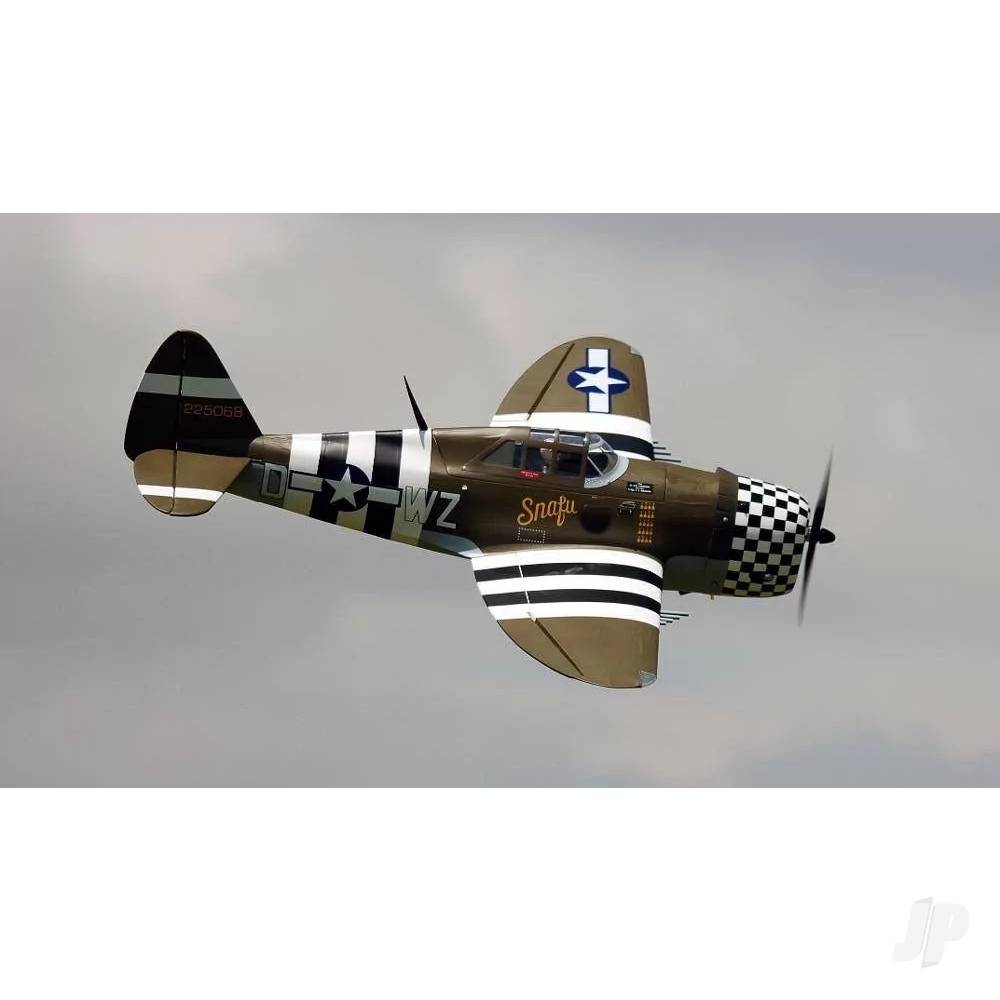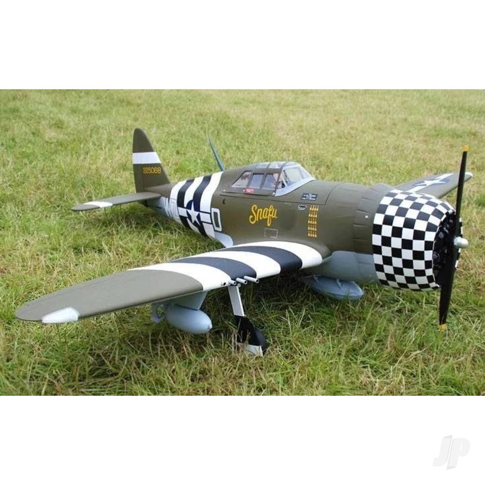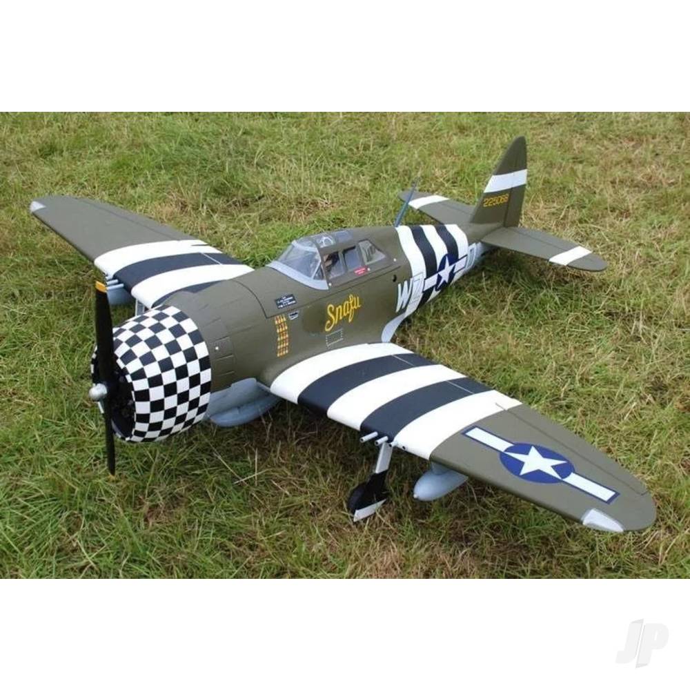 The P-47G Thunderbolt “Snafu” is a striking semi-scale warbird that delivers scale realism, rugged presence, and enjoyable flying performance. With a 1.6m (63″) wingspan and electric retracts pre-installed, this ARTF model offers an excellent blend of convenience and realism for intermediate to advanced pilots.