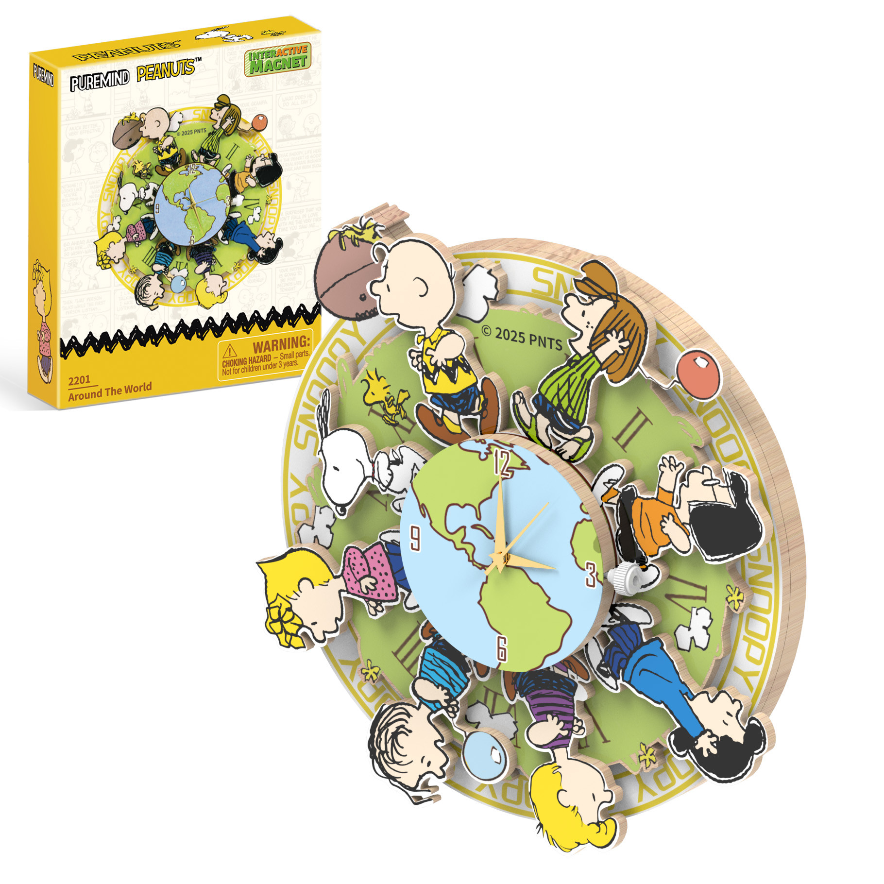 This is a wooden decorative wall magnet by Puremind. The model has a round shape with eight Peanuts™ characters that can be manually rotated around the central globe clock face. It will make an ideal wall decoration for the home or office, and great for both children and adults alike.