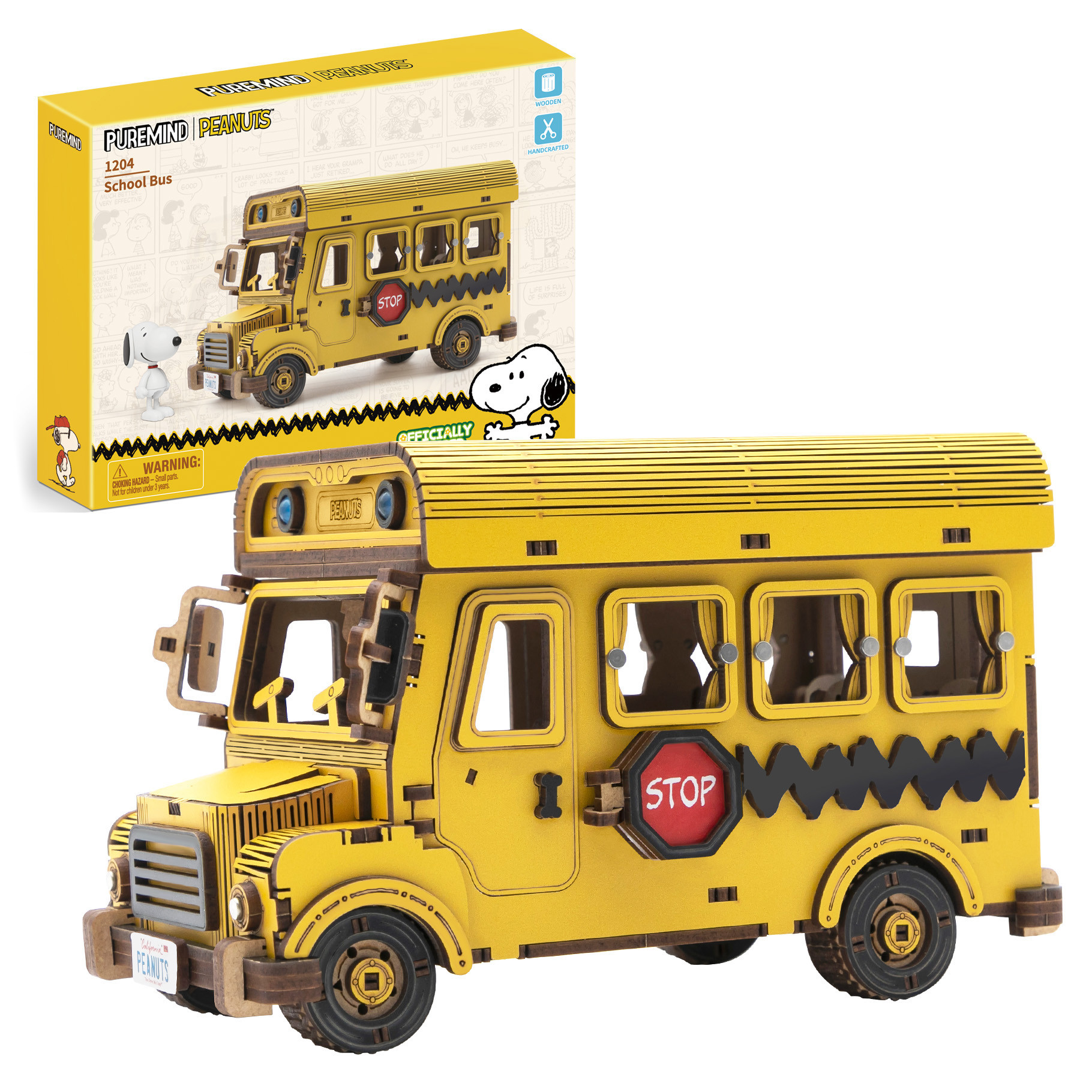 This is a self-build wooden model kit by Puremind; the pieces are pre-painted/coloured and just require snapping together to assemble (no glue is required). This kit gives you the chance to recreate the iconic yellow school bus from the classic Peanuts comic strip featuring the lovable Snoopy. A moulded mini-figure of Snoopy is also included for added fun. The roof of the bus can be removed to gain access to the detailed interior, while the Snoopy figure can also be placed inside the bus. An ideal kit to assemble for both new and experienced model kit builders.