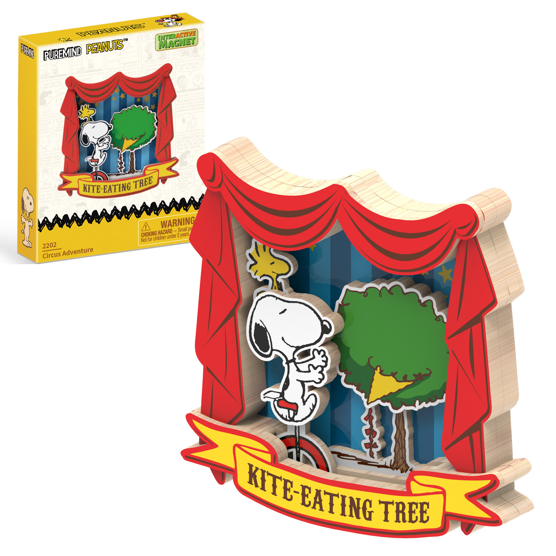 This is a wooden decorative wall magnet by Puremind. The model has a rectangular shape with Peanuts™ character Snoopy performing on a unicycle with the text “Kite-Eating Tree” at the bottom, all in front of a circus themed backdrop. It will make an ideal wall decoration for the home or office, and great for both children and adults alike.