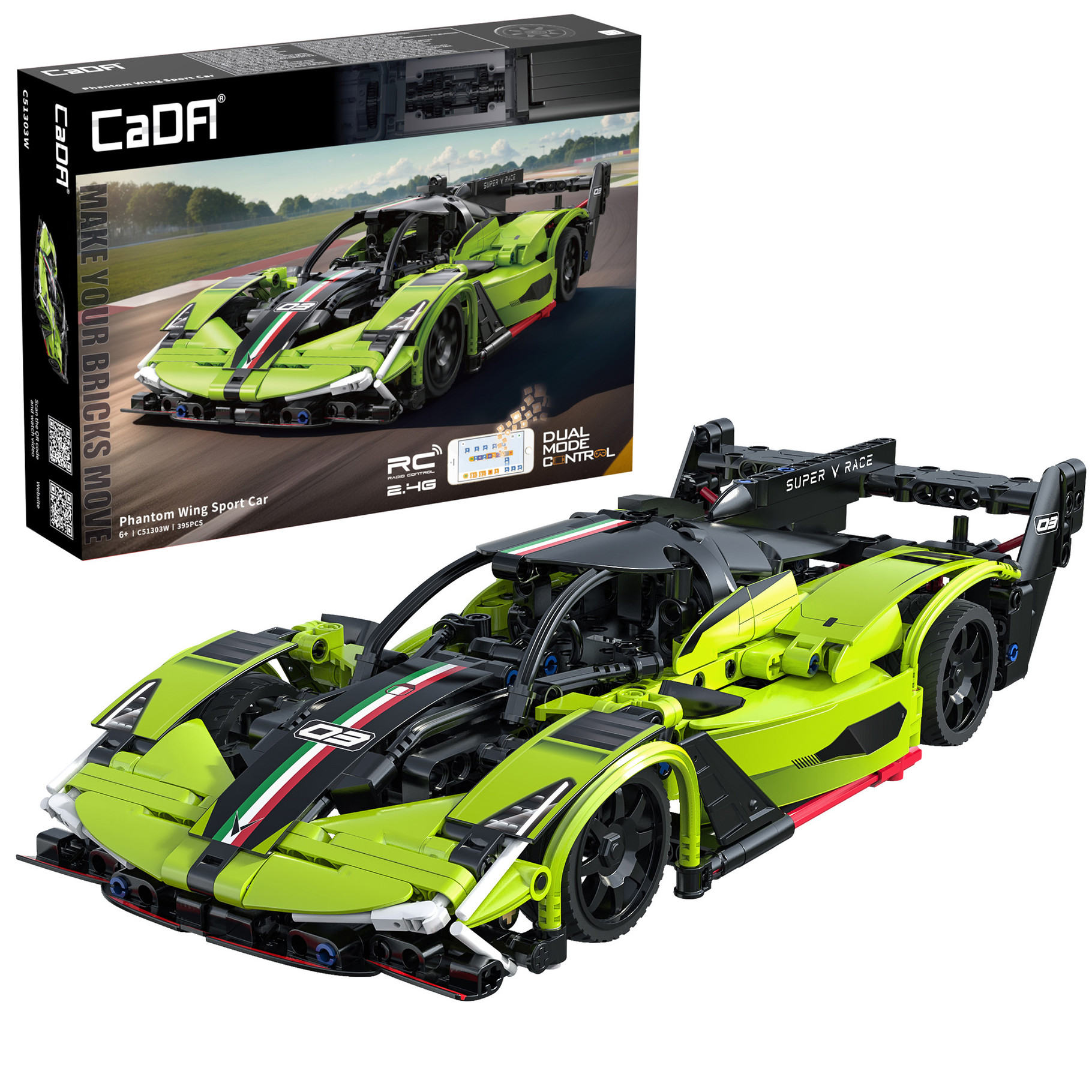 The CaDA “Phantom Wing” is a replica of a typical modern sports car complete with aggressive stance and aerodynamic design. It is in large 1:14 scale and can be remote controlled with the included joystick or via downloadable mobile app (see packaging for details). The sleek appearance means it is also perfect for displaying when not in use.